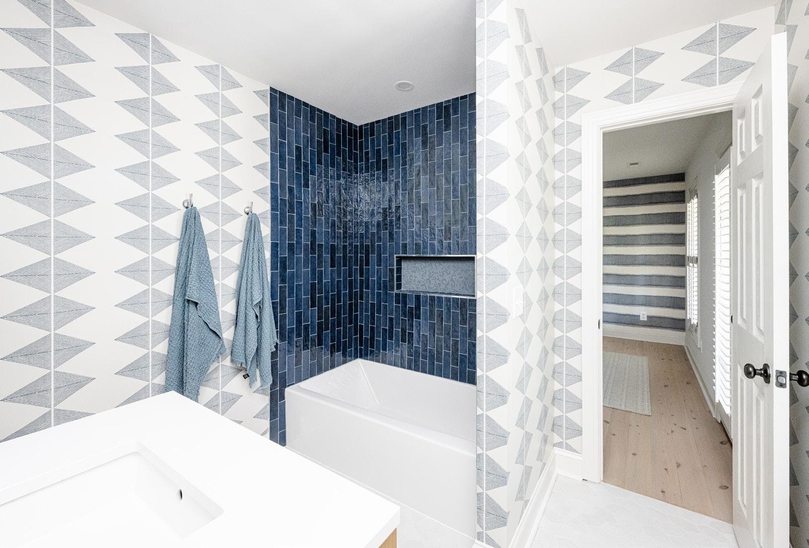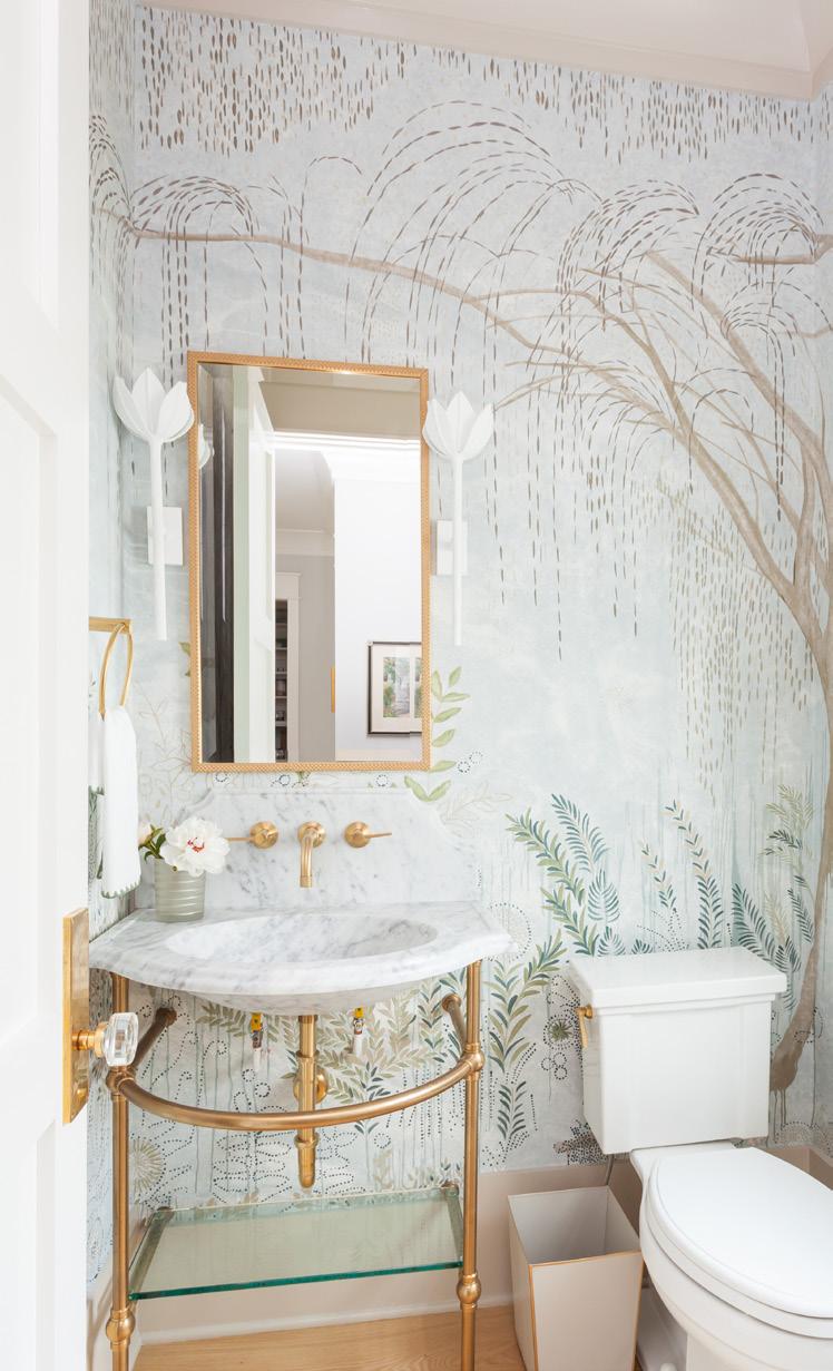 Tucked into a corner of the home, the powder bath makes a bold statement. When Andrea discovered the York wallpaper, she knew it would be the perfect way to