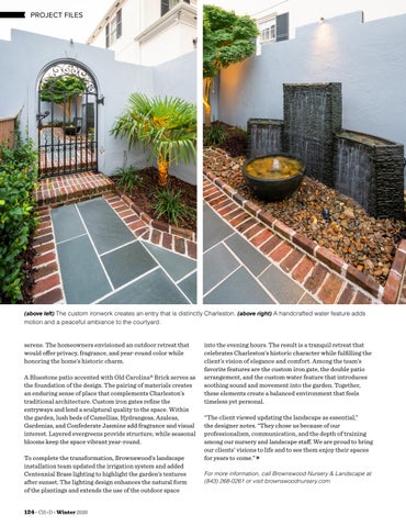 serene. The homeowners envisioned an outdoor retreat that would offer privacy, fragrance, and year-round color while honoring the home’s historic charm. A Bluestone patio accented with Old Carolina® Brick serves as the foundation of the design. The pairing of materials creates an enduring sense of place that complements Charleston’s traditional architecture. Custom iron gates refine the entryways and lend a sculptural quality to the space. Within the garden, lush beds of Camellias, Hydrangeas, Azaleas, Gardenias, and Confederate Jasmine add fragrance and visual interest. Layered evergreens provide structure, while seasonal blooms keep the space vibrant year-round. To complete the transformation, Brownswood’s landscape installation team updated the irrigation system and added Centennial Brass lighting to highlight the garden’s textures after sunset. The lighting design enhances the natural form of the plantings and extends the use of the outdoor space 124 • CH+D • Winter 2026