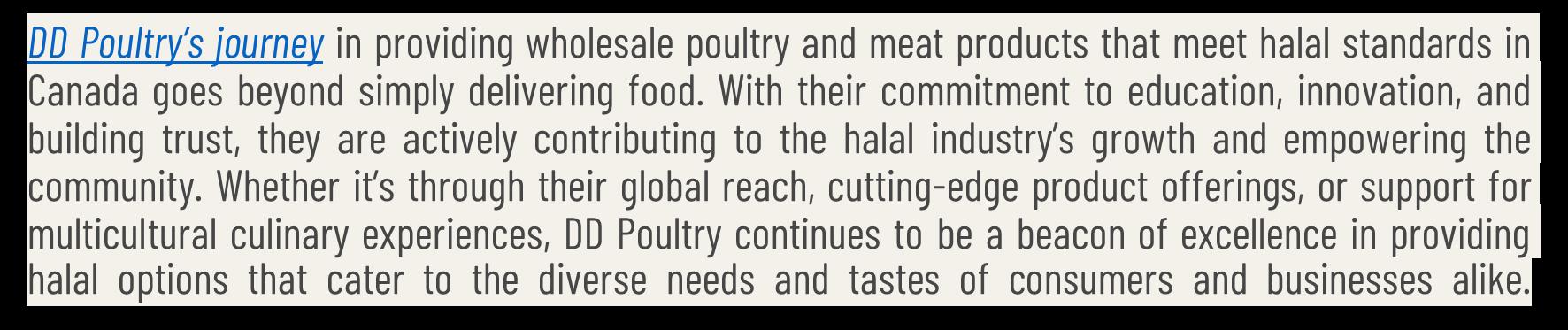 • At D&D Poultry we cater to a wide range of meat products for retail and wholesale. D&D Poultry has been in business for over 25 years, and has been a proud meat supplier for restaurants and families in Ontario and surrounding areas. D&D Poultry meat products are high quality source of protein. Our products are versatile and delicious option for a perfect meal.