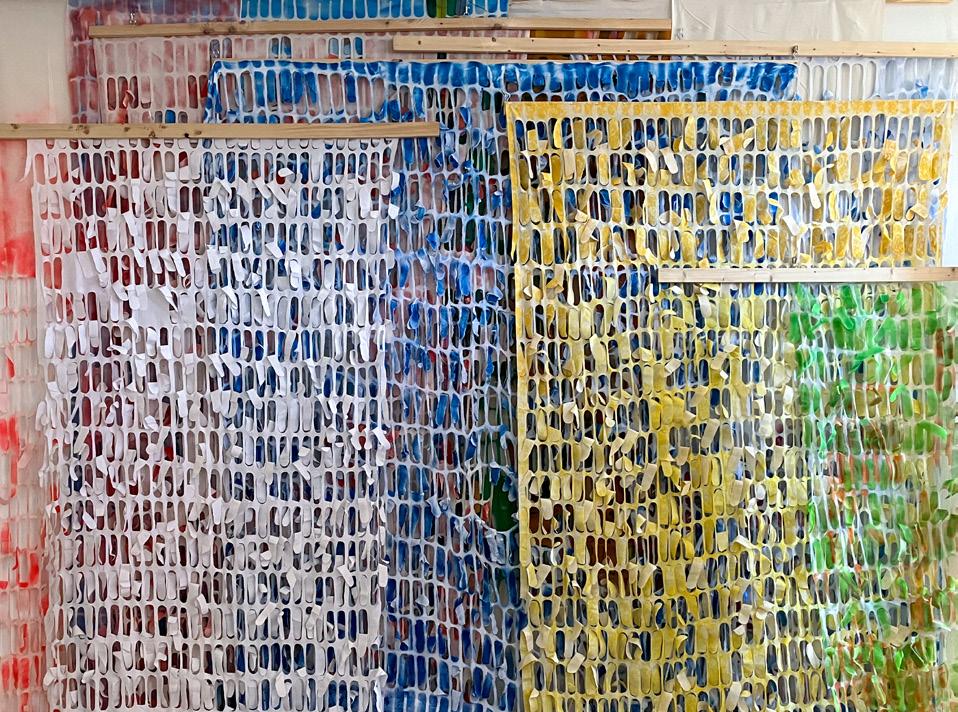El color se convierte en guía en el recorrido por el Salón Jorge Luis Borges de la sede de la Embajada de la República Argentina en Berlín. Sus tonos, producidos con rosas, azafrán, espirulina y cebollas transmiten memorias y evocan sensaciones que el cuerpo conserva en silencio.