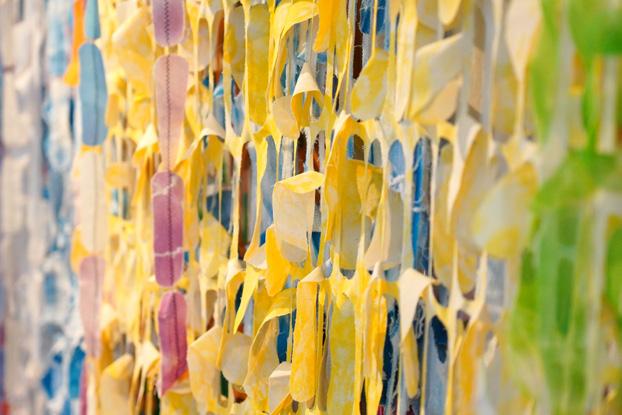 Bei einem Rundgang durch den Saal Jorge Luis Borges am Sitz der Botschaft der Argentinischen Republik in Berlin übernimmt die Farbe die führende Rolle. Die mit Rosen, Safran, Spirulina und Zwiebeln erzeugten