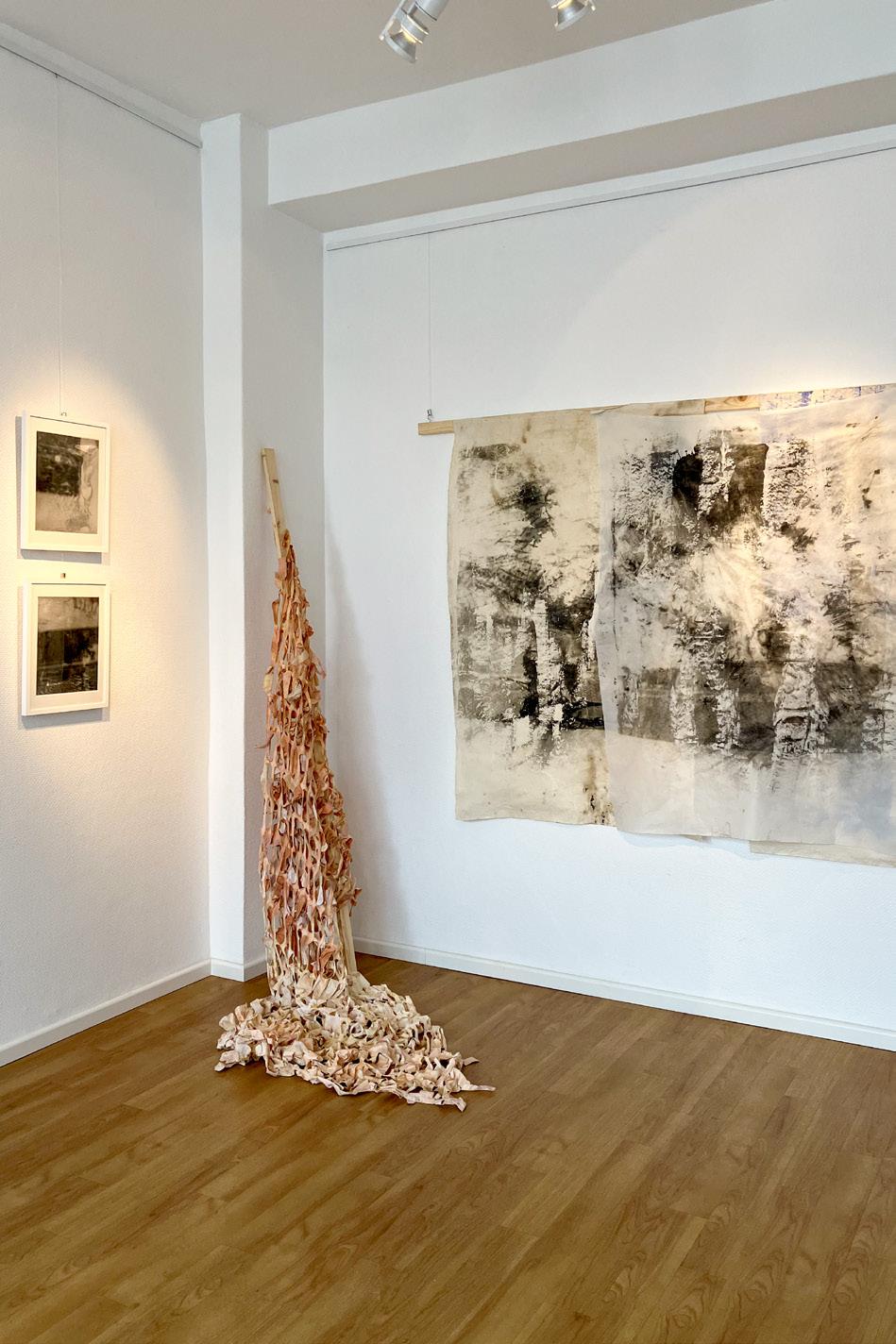 hervor, die der Körper in der Stille bewahrt. Der Druck eines Bildes auf eine Oberfläche durch die Natur ist die Poetik dieser Werke. Es ist eine große Herausforderung für die beiden Künstlerinnen, spezifische Präsentationsformen zu entwickeln, so dass sie den Ausstellungsraum nicht mit traditionellen Strukturen besetzen.