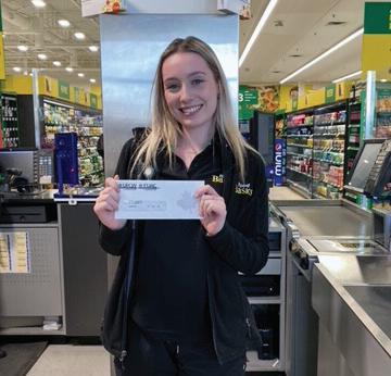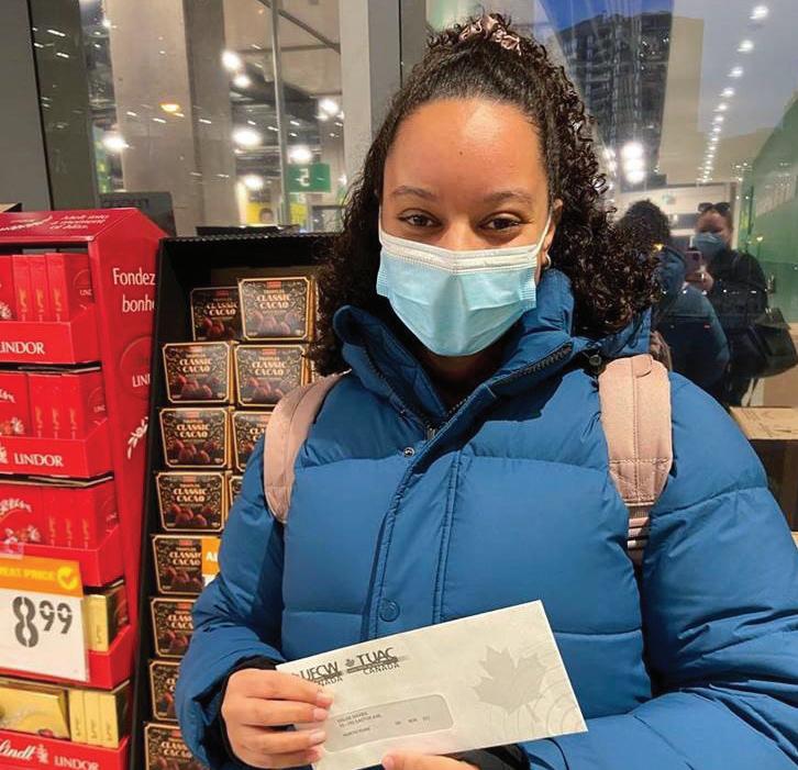 to UFCW Locals 175 & 633 Members (left to right) Hailey Schaefer (Food Basics), Franz Johnson (Park'N Fly; cheque for his son Seth pictured in the inset), Grace Tondreau (Fortinos), and Chloe Davies (Metro) BDM post-secondary scholarship from UFCW Canada.APRIL