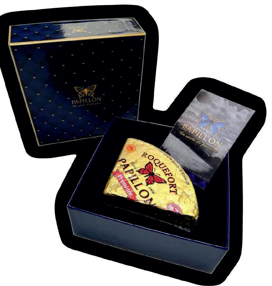 Ro q u e f o r t Pa p i l l o n s ū r i s y r a i š ekologinio žemės ūkio ir pasižymi savo balta ir dramblio kaulo spalva, švelnia ir lygia tekstūra. Intensyvios mėlynos spalvos dryžuotos ertmės suteikia šiam sūriui dosnų ir tipišką skonį, būdingą Roquefort.