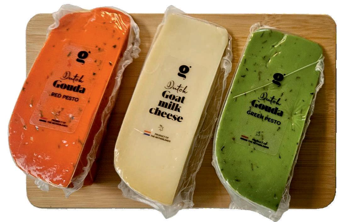 DUTCH FARMHOUSE olandiškų sūrių rinkinys. Jauname brandintame raudonojo pesto sūryje yra skanių raudonųjų pesto žolelių, įskaitant pomidorą, čili, česnaką ir ožragę. Žaliasis pesto sūris - įvairių žolelių, sumaltų grūstuvėje į aromatingą ir kvapnų mišinį, kompozicija, p r a t u r t i n t a t r a d i c i n ė m i s žaliosiomis pesto žolelėmis –bazilikais, kedro riešutais ir česnaku. Ožkos pieno sūris - nuo seniausių laikų ožkos pienu