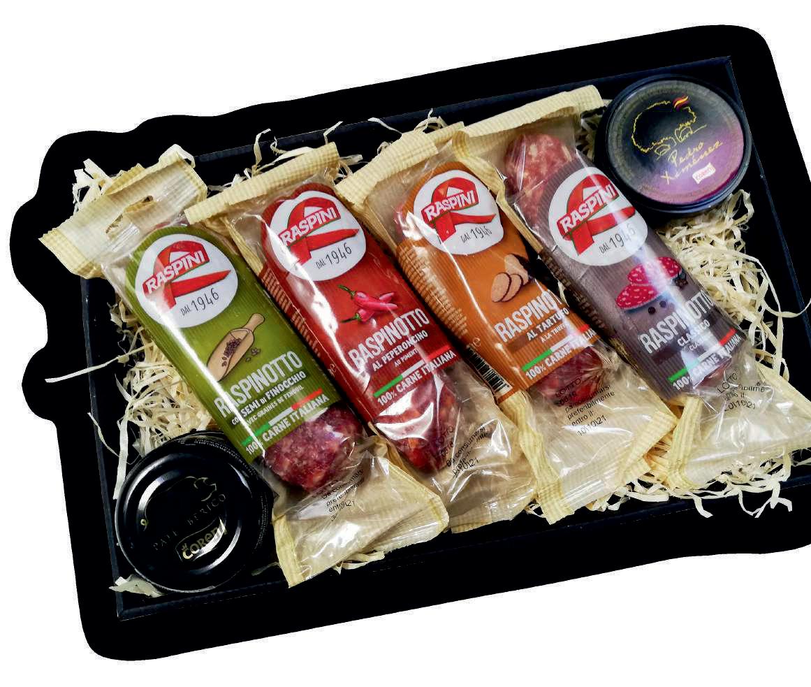 ITALIŠKŲ DEŠRŲ RINKINYS RASPINI tai keturios, skirtingų rūšių saliami dešros. Klasikinis saliami – jo gamyboje naudojamas „Barbera“ vynas. Saliamis su pankolio sėklomis, klasikinis Toskanos receptas, kuriame esančios pankolio sėklos suteiks sodrų aromatą ir nepakartojamą skonį. Na o rinkinio puošmena unikalaus skonio saliamiai su trumais bei čili pipirais nepaliks abejingo nei vieno!