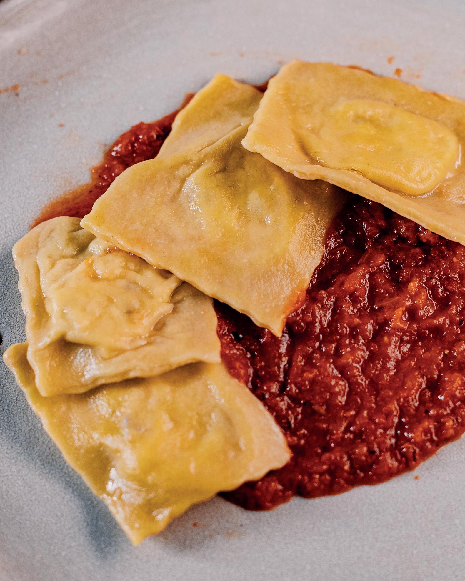 Decore conforme desejar e sirva imediatamente, para desfrutar desta deliciosa receita de massa colorida com molho de tomate e recheio.