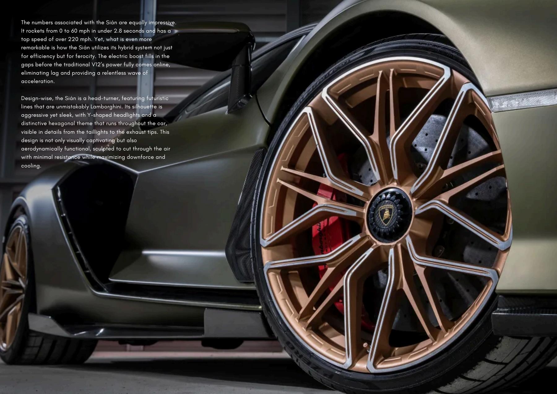 Inside, the cabin of the Sián is a luxurious fusion of technology and comfort, adorned with the finest materials and boasting an advanced infotainment system. The digital displays are crisp and provide real-time data on the hybrid system, enhancing the driving experience by keeping the driver fully informed of the car ’ s dynamics