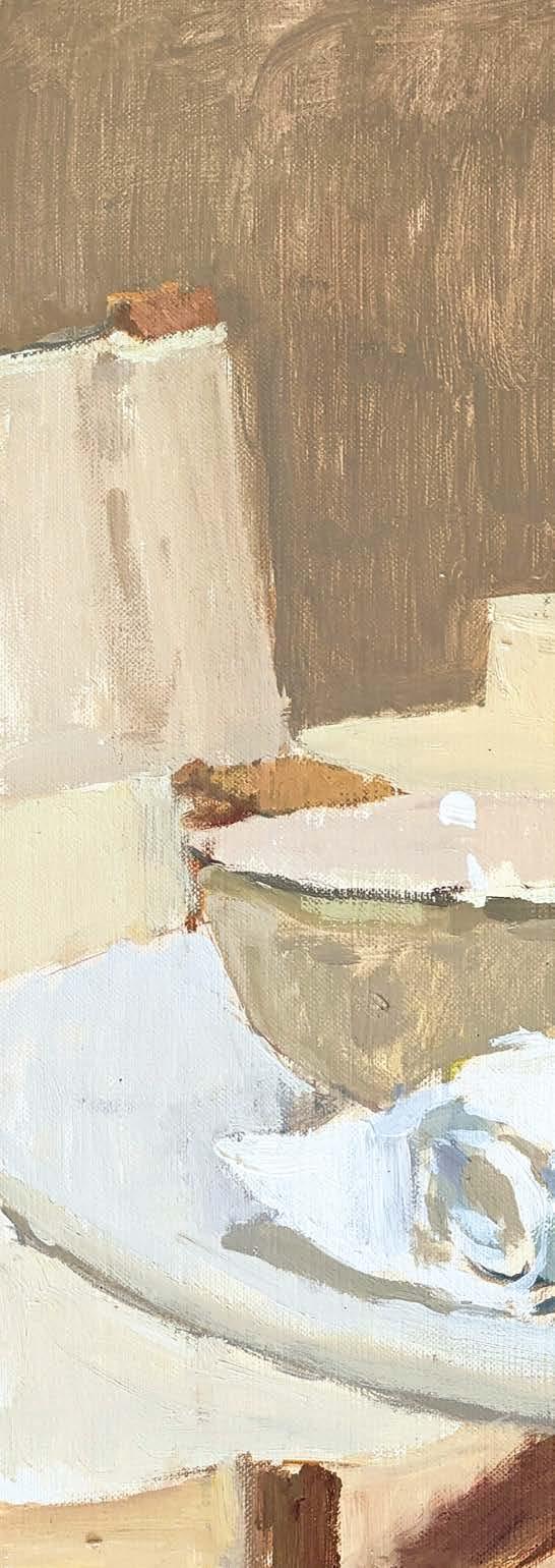 This year, I wanted to push myself to take on more interior paintings rather than just still life. [This] was a painting that was unusual in that it required almost no initial composition. In fact, I had only started the painting to try out a new canvas. That morning, I was looking for a still life arrangement, but when I walked by the washroom door, I was struck by the light coming through the window.