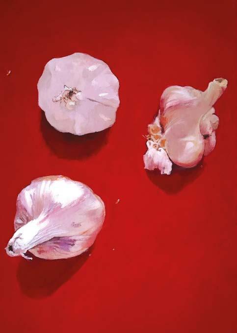 I appreciate the overall composition, where light interacts and bounces between different elements. Specifically, the highly chromatic orange hue transitioning onto the red onions catches my attention. I also find delight in the interplay of light and shadow values throughout the composition, forming a captivating pattern.
