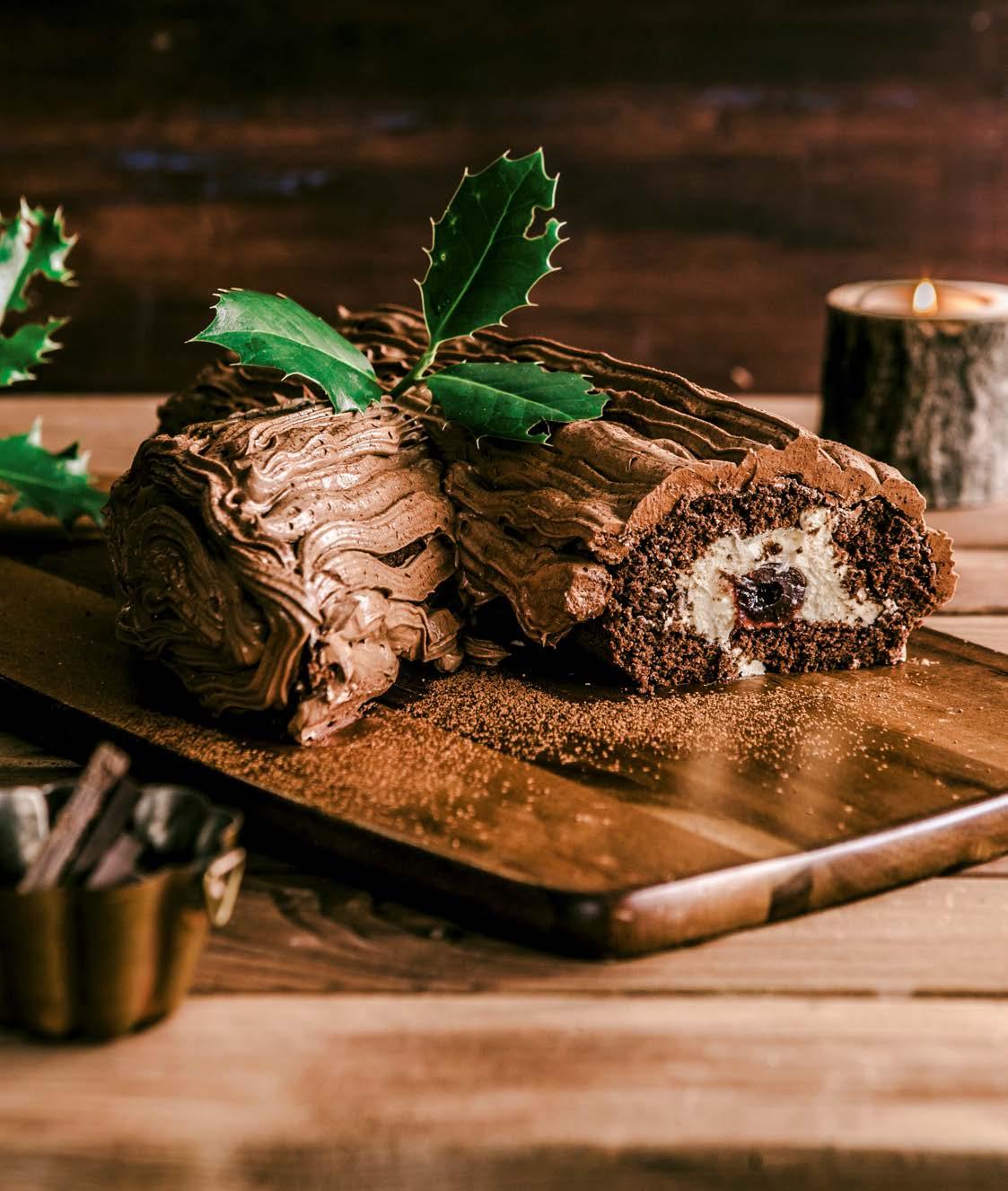 A swiss roll style-sponge is decorated to resemble a log and enjoyed as an alternative to rich, iced fruit cakes. Visit our website, theenglishhome.co.uk to find the recipe for this black forest gateaux-inspired version. Try other festive flavourings, such as chocolate orange or salted caramel too.