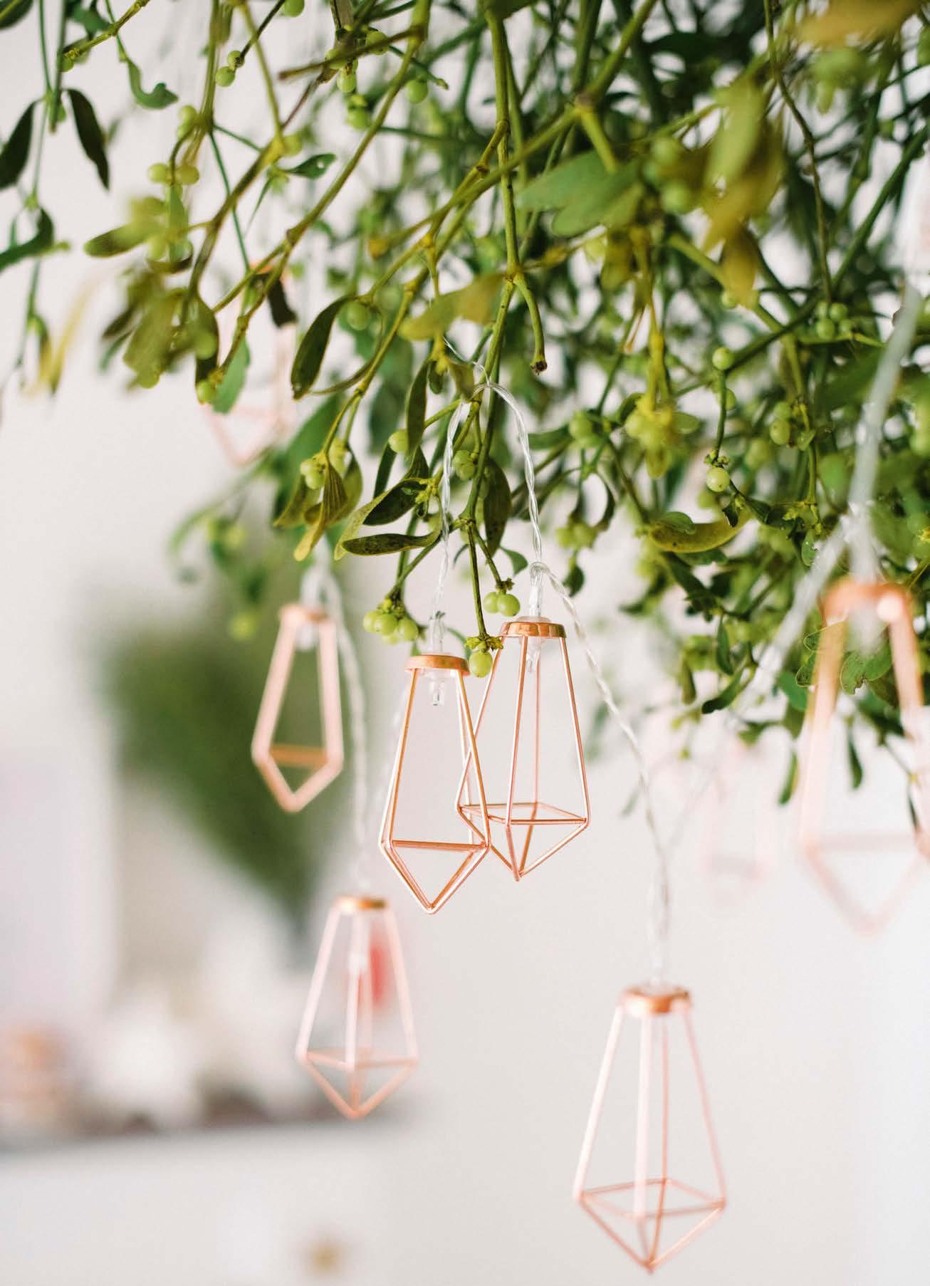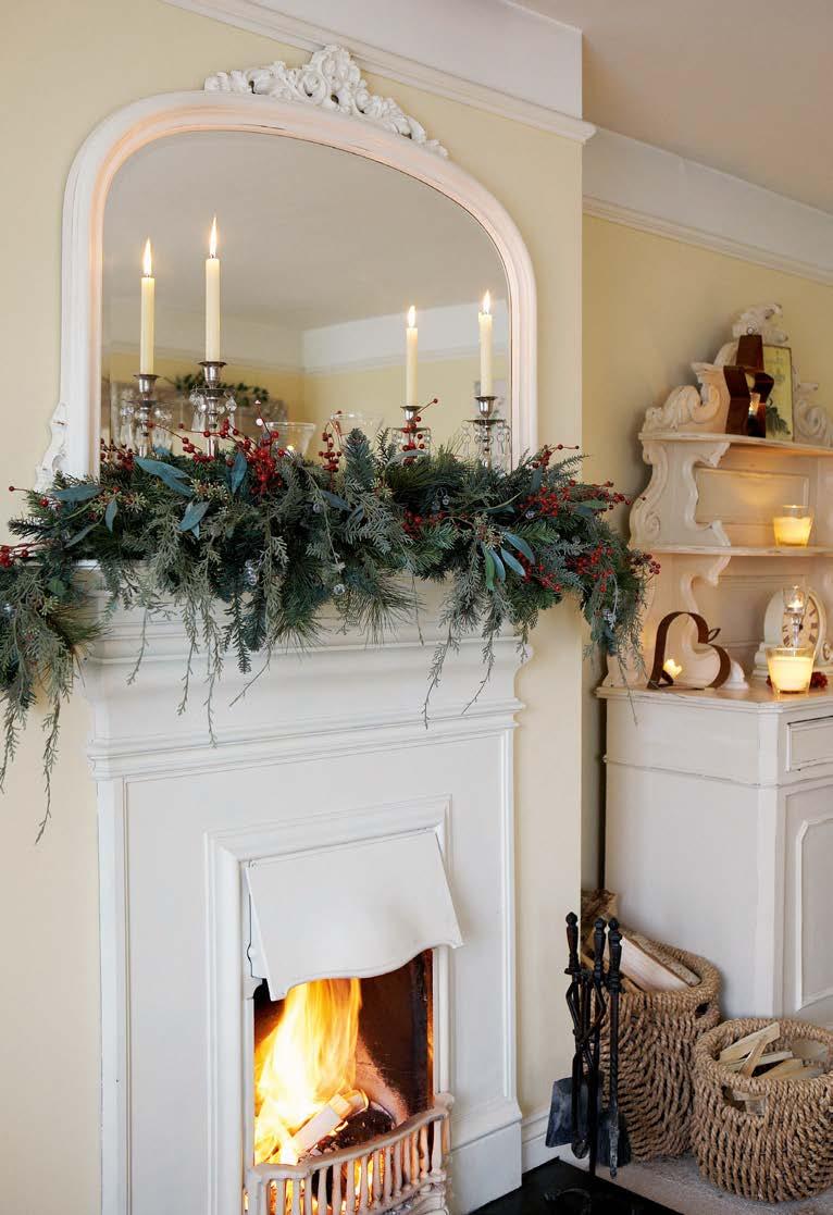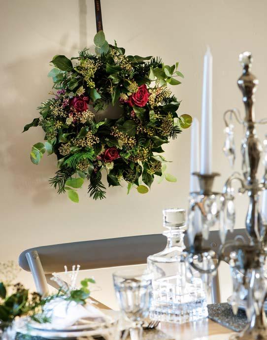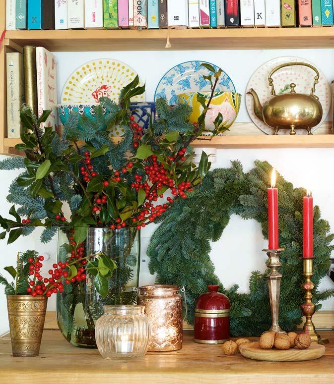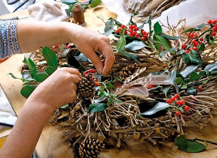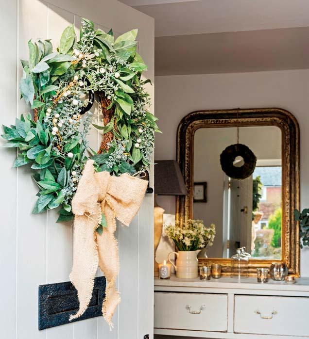 rather more light-heartedly, and hung in hallways to encourage a friendly greeting. A simple bunch can be tied with a ribbon and hung, or more elaborate displays or ‘kissing boughs’ can be created. Sprigs of mistletoe and its glossy white berries also make lovely additions to wreaths and garlands too, as a contrast to rich, ruby-red holly berries.
