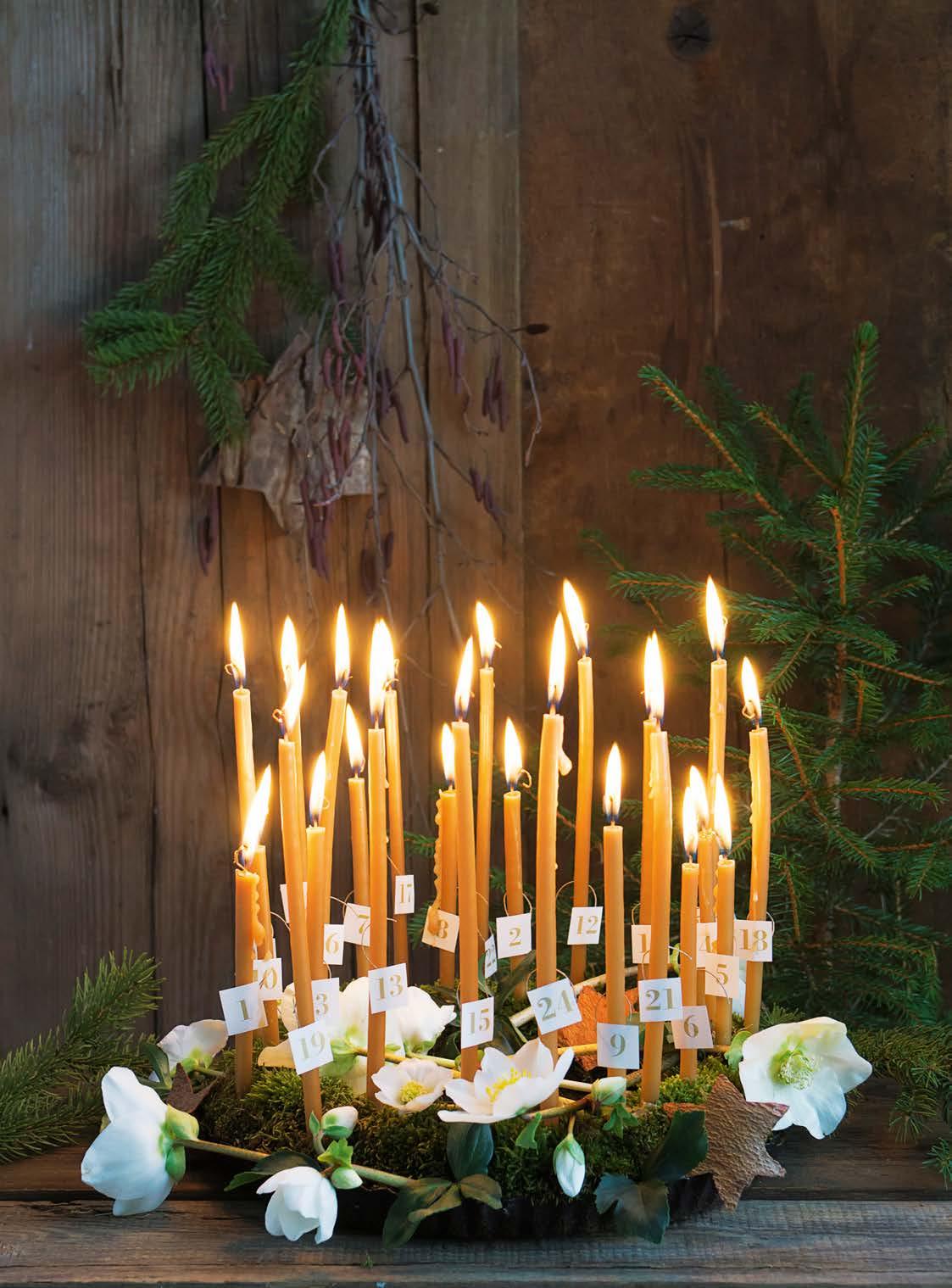 • Advent candles are a classic choice – some options are a single candle that is burned each day to a numbered point; other candle-calendar options are displays where a new lit candle is added each day to a wreath or centrepiece. By Christmas Eve, it will be beautifully aglow with 24 flickering flames.