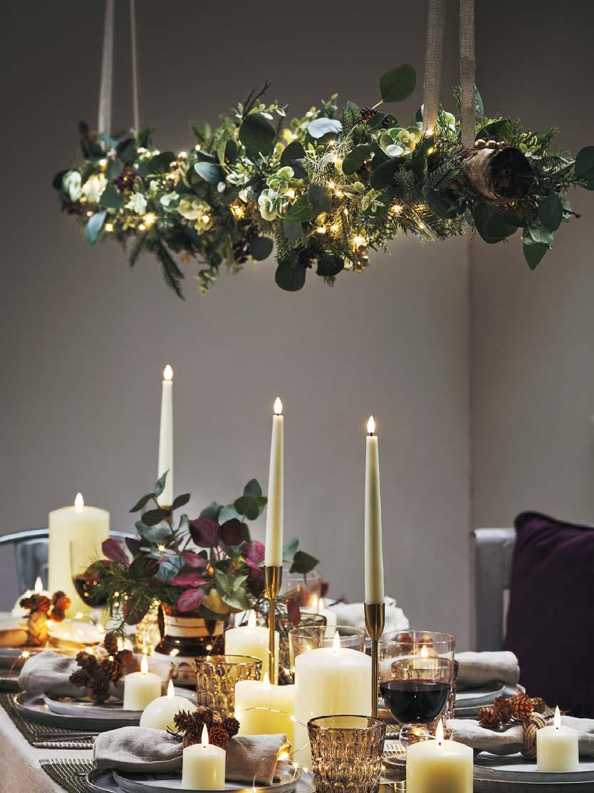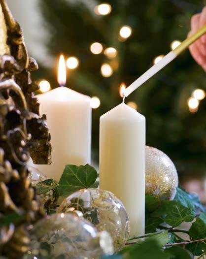 From the twinkle of bulbs on the tree and flickering candles at dinner to brilliantly illuminated displays in towns, the glow of lights at Christmas creates a magical atmosphere. Many towns and cities host grand ‘switching-on’ ceremonies with a countdown to the big moment. Lights might be strung along streets, wrapped around trees or even cast as colourful projections on iconic buildings to make late-night Christmas shopping trips a little more joyful. Residential areas also put on a show, with neighbours gently competing to put on the best display. Strings of lights across porches and bay windows; perhaps a light-up reindeer in the front garden and some glowing bulbs in outdoor trees, all in tasteful warm white, create a magical welcome to guests, delight passers-by, and bring cheer to the neighbourhood on cold, wintry nights. Meanwhile, indoors you can set the scene with fairy lights, candles and a roaring fire. Scented candles add an extra festive layer, but classic church candles are an authentic choice. Layer in different sizes and use on tables, on the mantel or hearth, or even arrange them in an empty fireplace to add a warming glow. Good-quality LED candles are a great safety-conscious choice that will also last for years.