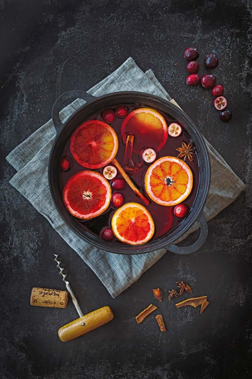 • Slice the blood orange. Place in a saucepan with the cinnamon sticks. Halve the cranberries, if large, and add to the pan along with the star anise pods, sugar, rum and red wine. Heat through (but