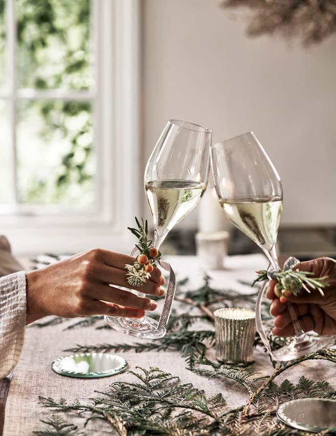 R may also be for rejoicing, as families and friends gather to celebrate together. It is a time that brings together all generations, often in one house, with children sharing rooms and any available chair brought to squeeze another person around the table. Whether expecting a houseful or just one or two guests, it is a nice gesture to make them feel at home over such a special time. Adding a few festive touches to a guest room gives them a space to enjoy away from the bustle. A scented candle, some twinkling lights, perhaps a wreath hung on the wall…even a few little gifts wrapped up by the bed – some luxurious toiletries and a pair of slippers – would all be gladly welcomed. Champagne glasses, below, The White Company