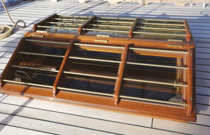 The teak for the decking, the 1½in thick coamings and for the traditional skylight on the coachroof, had been reclaimed from a 1920s cruise ship which had been scrapped. “I chanced upon a local chap who had been bequeathed a load of it by his dad,” said Ben. “He had used most of it to floor his entire house and I offered to remake his floors in oak in return for the teak, but he said it was too much hassle.” But he still had a number of unused 15ft x 5½in x 2½in boards, which Ben was able to buy from him, albeit with some former fastening holes and ingrained iron stain in them, some of which is now visible in the skylight. “But I think that’s fine,” said Ben, “because it tells a story of where it came from.”