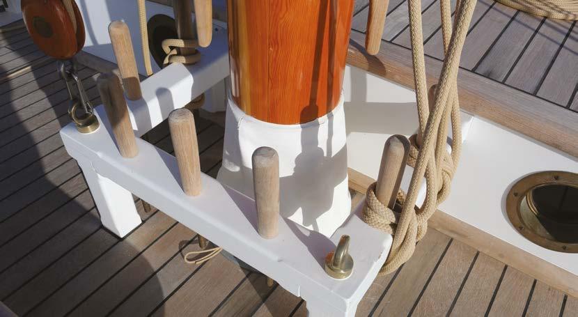 Facing page, clockwise from top left: The teak for the decking was reclaimed from a 1920s cruise ship; Ben Harris’s builder’s plate; Traditional teak skylight over the saloon; The Fife rail around the mast; The forepeak; View of the galley from the chart table; Mainsheet block; Goosenecks