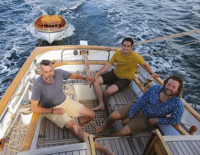 fir with a hollow gaff and the others solid. John Albrecht made up the rigging and many of the stainless steel fabrications; Colin Frake supplied much of the galvanised hardware and the blocks; the self-tailing winches are from Australian company Hutton Arco and many other deck and rig fittings came from Davey & Co and Toplicht. The sails are by Ratsey & Lapthorn. Throughout the build of the hull, Simon spent two or three days a week working with Ben and his core team of Pete Paxton, James Pardo and Josh Neely “doing whatever I was told to do”. But 11 days after the shutter plank was fitted the first Covid lockdown began and, as Simon’s circumstances then put him in a medically vulnerable category, that forced the end of his hands-on involvement. “As I am a perfectionist I was initially concerned that I would be frustrated not being involved in the build,” he said. “But whenever I managed to visit I was never disappointed with the workmanship or the decisions Ben had made. I completely trusted the way he and his team worked.” With the intention of remaining at least remotely involved, Simon planned to build Constance’s clinker tender but, after losing his workshop when he and Kay sold their house, he was unable to do so. The tender was then built by Josh, alongside Constance. Constance’s build started in September 2019 with an original plan to launch sometime in 2021. However, Covid restrictions and consequent increases in lead times for materials and equipment held things up, and