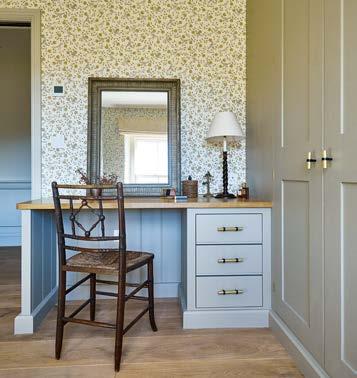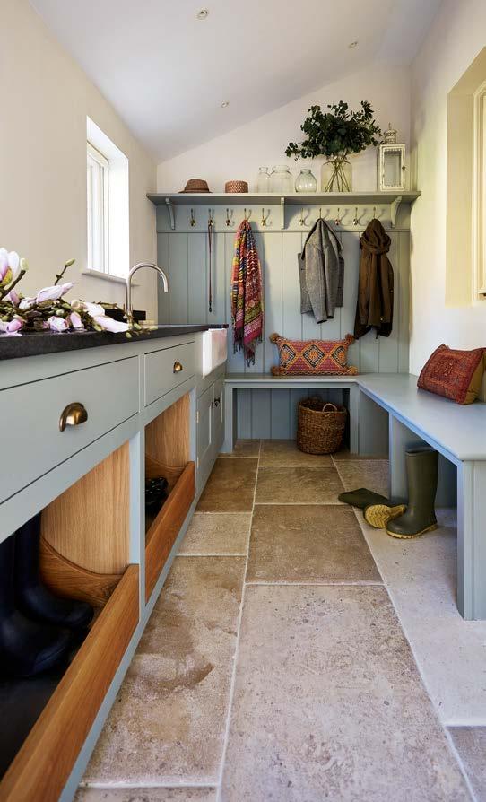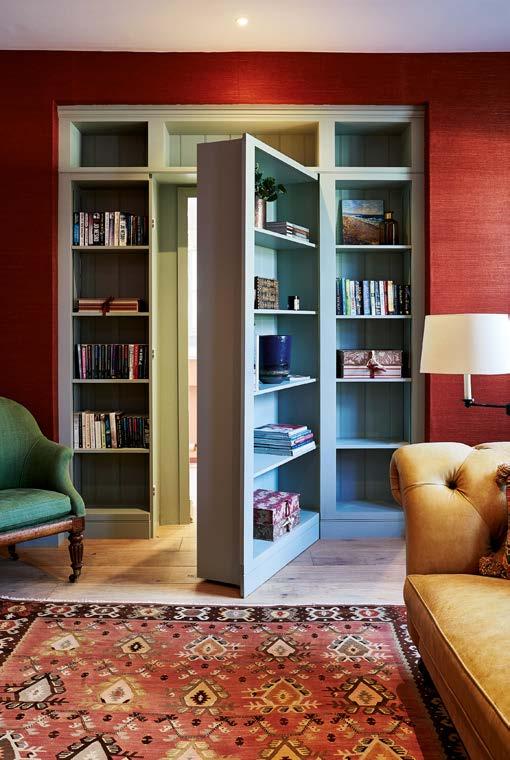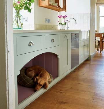 ABOVE Classic-style kitchen, hand-painted in Farrow & Ball’s Light Blue and Porphyry Pink, from £36,000. FAR LEFT Boot room with solid oak pull-out boot and shoe storage, from £24,000. LEFT Secret door and passageway to the kitchen, from £5,400. OPPOSITE PAGE, LEFT TO RIGHT Dog bed incorporated within cabinetry, from £960. Window seat with internal storage, from £1,800. Classic-style bedroom furniture, with solid oak dressing table top and internals, from £15,000.
