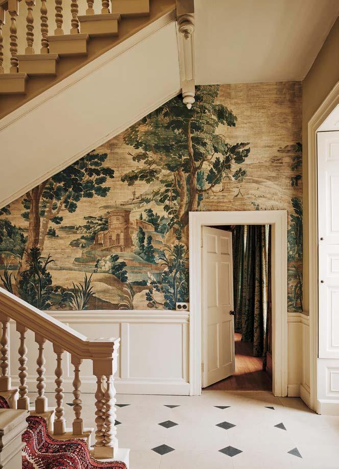 RIGHT Watts of Westminster’s Tableaux Scéniques are antique woven tapestries and hand-painted papers transcribed into digitally printed panoramic textiles and wallpapers. They can be made in different colourways and scales, with and without fi gures, and printed onto different substrates. Shown here is the Wolterton Verdure tapestry in the Glenmore colourway, printed on grasscloth.