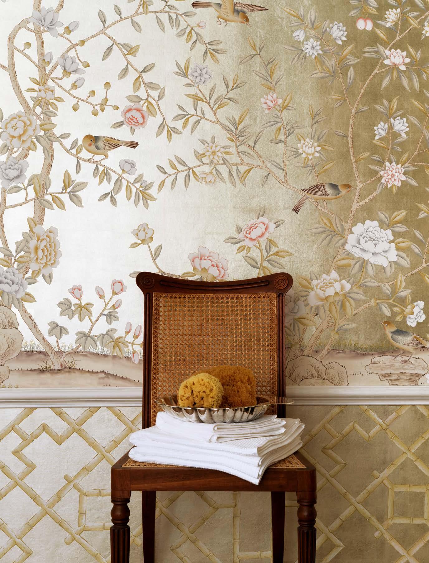 De Gournay creates fi ne hand-painted and hand-embroidered wallcoverings, working to a specifi c brief for each client. Shown here is its Chatsworth chinoiserie design, painted on 12-carat white gold gilded paper, from £1,166 a panel (915mm width).