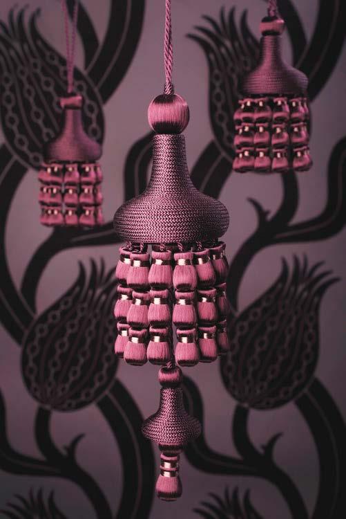 ABOVE This drawing room by Nicky Dobree includes bespoke joinery, seating, curtains, blinds, elegant oval brass window handles, and a Kelly Wearstler rug made by The Rug Company to a custom size. LEFT The Ealing Pendant from David Hunt Lighting can be sprayed in any colour of choice by the company’s custom service. ABOVE RIGHT Passementerie specialist Samuel & Sons offers a semi-custom and a full-custom service which offers trimmings tailored to the specification. RIGHT Architectural ironmongery firm Croft offers a bespoke design service. From the initial idea, the team develops computer renderings and 3D-printed samples before crafting each piece. BESPOKE BRANDS