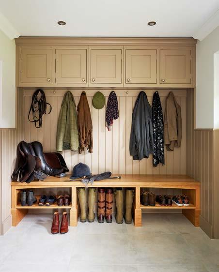 TOP & ABOVE RIGHT This London home office was designed and made by luxury bespoke furniture specialists Gosling. The desk has been built around the radiator under the window and flows into the bookshelves to create a visually harmonious room. ABOVE LEFT The mirror-panelled walls of this bathroom by Azelle Design reflect light and create impact. They were designed and handmade by Dominic Schuster. LEFT With high-level cupboards and low-level shoe shelves, plus a bench seat and hooks for coats, hats and tack, this bespoke boot room by Davonport was created to suit the home owner’s specific requirements. Bespoke designs by Davonport start from £35,000.