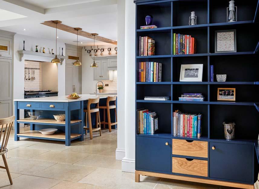 RIGHT In this open-plan space by Christopher Peters Bespoke Kitchens & Interiors, the blue and natural oak storage unit complements the kitchen cabinetry and links the kitchen with the dining area.