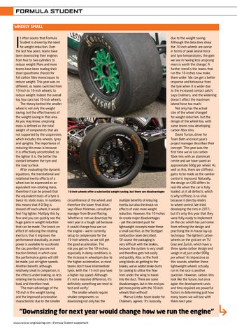 t often seems that Formula Student is driven by the need for weight reduction. Over the last few years, teams have been downsizing their engines from four to two cylinders to reduce weight. More and more teams have been trading their steel spaceframe chassis for full carbon fibre monocoques to reduce weight. This year was no different, as teams switched from 13-inch to 10-inch wheels; to reduce weight. Indeed the overall top four cars had 10-inch wheels. The theory behind the smaller wheel is not only the weight saving, but the effectiveness of the weight saving in that area. As you may know, unsprung mass is defined as the total weight of components that are not supported by the suspension, which includes the wheels, tyres and uprights. The importance of reducing this mass is because it is effectively uncontrolled, so the lighter it is, the better the contact between the tyre and the road surface. After evaluating the dynamic equations, the translational and rotational inertia effects of a wheel can be expressed as an equivalent non-rotating mass, therefore it can be proved that the equivalent mass of a tyre is twice its static mass. In numbers this means that if 0.5kg is shaved off each wheel, it would feel 1kg lighter. Multiply this by four and you can quickly see the huge gains in weight reduction that can be made. The knock-on effect of reducing the rotating inertia is that it improves the performance drastically, as more power is available to accelerate the car, provided you are not traction limited, in which case the performance gains will still be made, just at higher speeds. Another benefit, although relatively small in comparison, is the effects under braking, as less rotating inertia reduces the brake load, and therefore heat. ‘The main advantage of the 10-inch is the weight saving and the improved acceleration characteristic due to the smaller