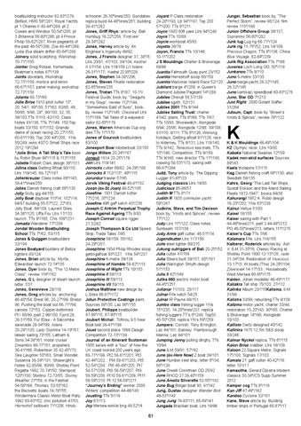 boatbuilding instructor 82-83*/279; Belfast, HMS 58*/281; Royal Yachts pt 1 Charles II 40-44*/284; pt 2 Cowes and Windsor 50-54*/285; pt 3 Britannia 56-60*/286; pt 4 Prince Philip 58-62*/287; River pageants of the past 46-50*/288; Zoe 40-44*/289; Lydia Eva steam drifter 60-64*/289 Joinery solid scarphing, Workshop 70-71*/155 Jointer Greg Rössel, homemade, Boatman’s notes 87*/139 Joints dovetails, Workshop 72-73*/156; mortice and tenon 66-67*/157; panel making, workshop 72-73*/158 Jolanta 68-73*/68 Jolie Brise 1913 pilot cutter 13*, 20, 54/1; 89*/30; 51*/62; 62/85; 49, 50/95; 5/96; 28*, 90/100; 32, 35, 36/103;TTs 7/110; 42/110; Class Notes 91/136; TTs 7*/149; 150 Top boats 33/150; 61*/152; Grande dame of ocean racing 20-27*/155; 60-61*/199; Top 200 44*/200; YNs 50/249; wins ASTO Small Ships race 2012 19*/294 “Jolie Brise, A Tall Ship’s Tale book by Robin Bryer 98*/115 & 113*/155 Joliette Robert Clark design 38*/131 Jolina class Getting Afloat 90/110; Ltrs 119/145; 68-72*/187 Jollenkreuzer Class notes 89*/143; 38-41*lines/256 Jolles Danish fishing craft 66*/130 Jolly Scilly gig 44/155 Jolly Boat dayboat 110*/4; 102*/14; 64/97 building 55-57*/22; 22*/63; Jolly Boat, 64/109; Laurent Giles 34-36*/120; Uffa Fox Ltrs 17/133; launch, TTs 9*/160; CNs 109*/231 Jomada Wanderer 77*/208 Jondal Wooden Boatbuilding School TTs 7*/62; 53/115 Jones & Quiggen boatbuilders 32/104 Jones Boatyard builders of Belize lighters 43/124 Jones, Brian article by: Myrtle, Edwardian launch 72-74*/35 Jones, Dyer book by, "The 12-Metre Class", review 114*/162 Jones, G L designer of steam launch, letter 7/37 Jones, Genevieve 28/118 Jones, Greg articles by: anchoring 46-48*/54; Brest 96, 20-27*/99; Bristol 96, Pushing the boat out 66-71*/98; canoes 72*/53; Copper-bottomed Pt I 90/99, part 2 96/100; Fjord 28, 28-31*/59; Fur Elise - A Salcombe serenade 28-34*/99; Iolaire 25-29*/120; Lady Sophina 14-19*/57; lateen sailing 73*/55; Latham & Sons 34-38*/61; motor cruiser Dreamtoo 66-71*/51; propellers 36-41*/66; Robertson 35 42-45*/73; Sea Laughter 50*/63; Small Wonder, Susanna 36-39*/101; Shipwright’s Notes 82-85/98, 90/99; Shotley Point Regatta 1992 70-74*/50; Sternpost 120*/150; Stintino 72-73/55; Stormy Weather 21*/58, in the Fastnet 54-58*/64; Thomas, 53-55*/62; the Becketts’ boats 74-78*/55; Windermere Classic Motor Boat Rally 1992 60-63*/52; zinc pollution 47/53; Herreshof sailboats 71*/206; Hindu