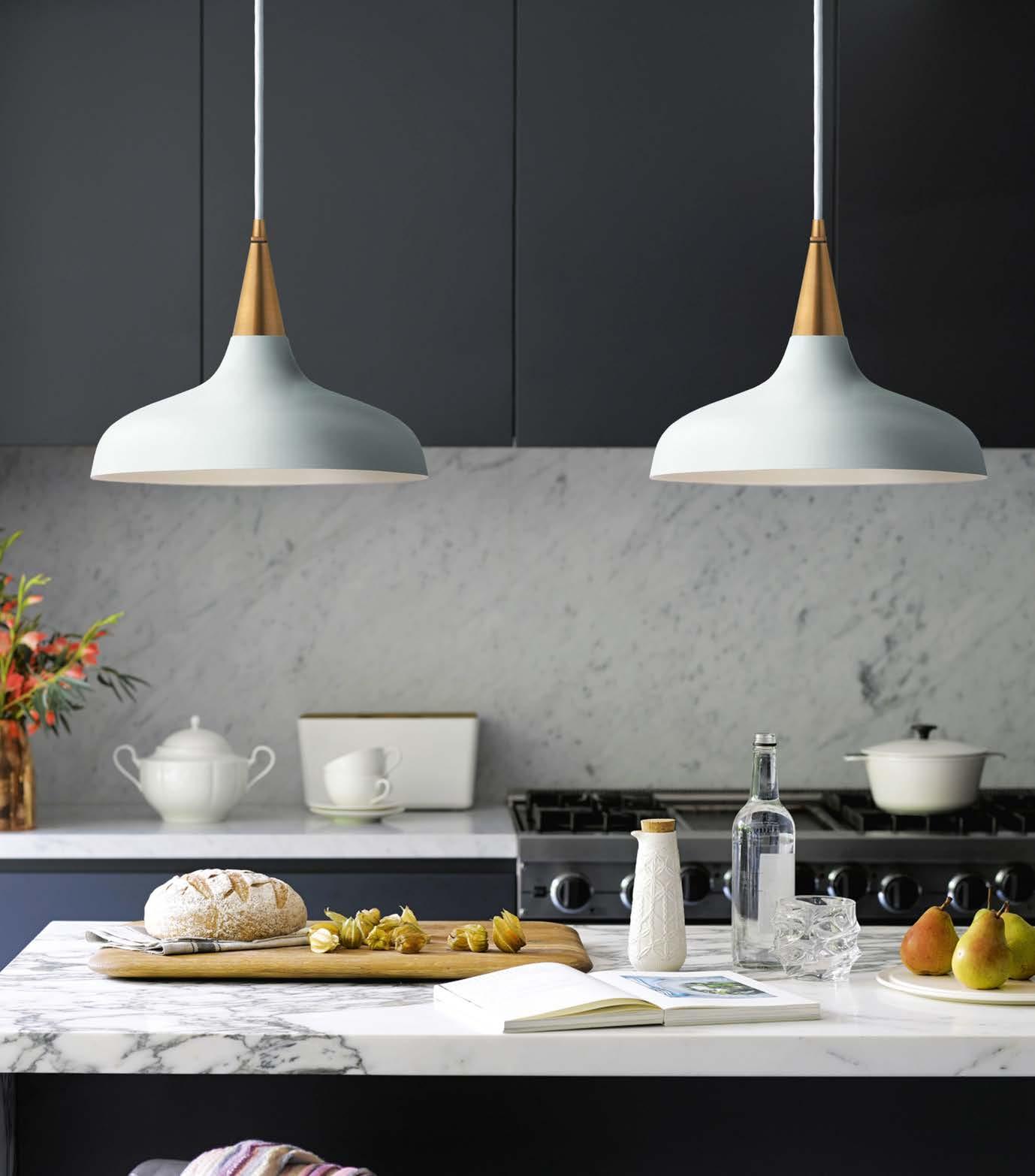 Add to a symmetrical kitchen layout with a trio of pendants. Lights, Slate Grey Classic Traditional, £545 each, Curiousa; kitchen, Martin Moore OPPOSITE Assess how the kitchen island and pendant shades will work visually when viewed together. Constance shade, Stone, £44; cone pendant fitting kit, £46, Pooky