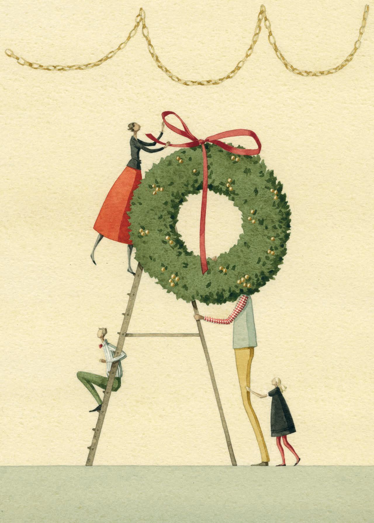 This charming Laura Stoddart illustration shows a family decking the halls ahead of Christmas festivities. laurastoddart.com