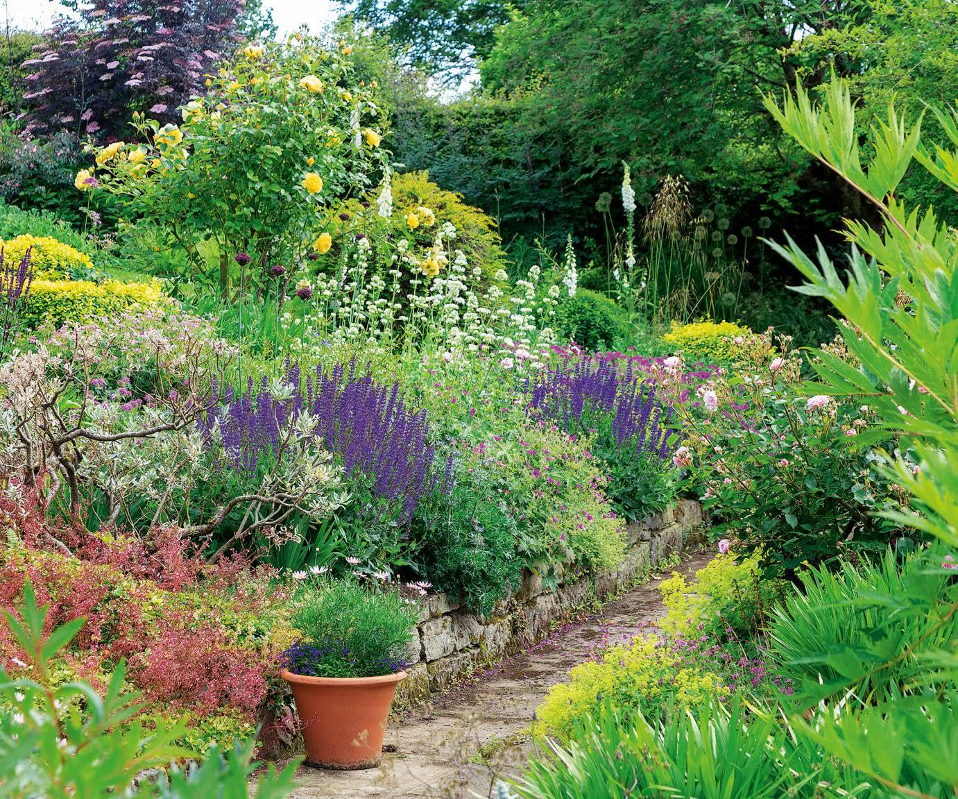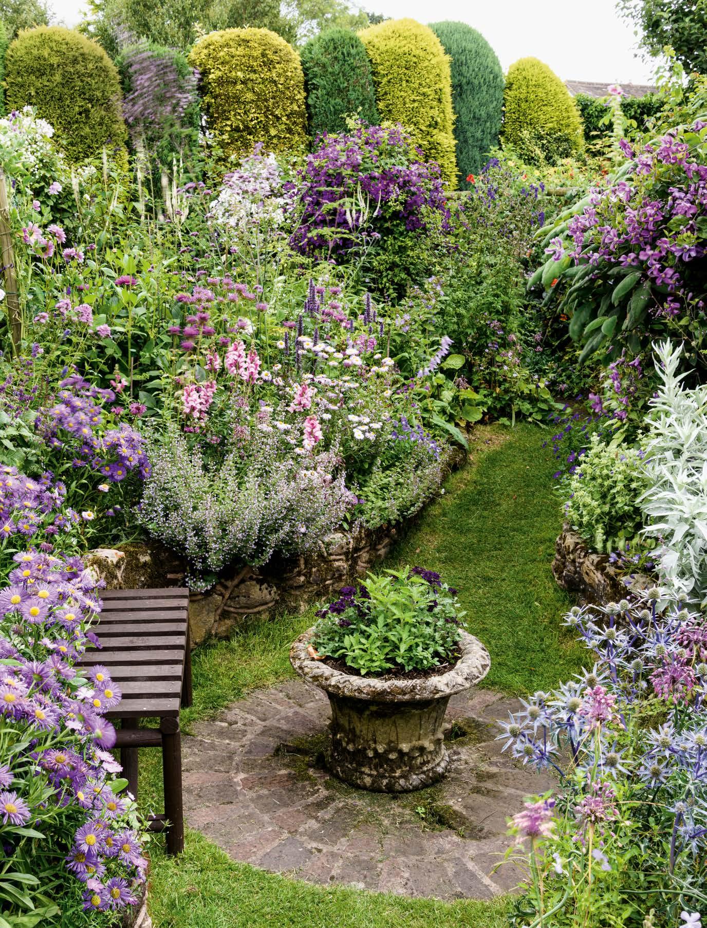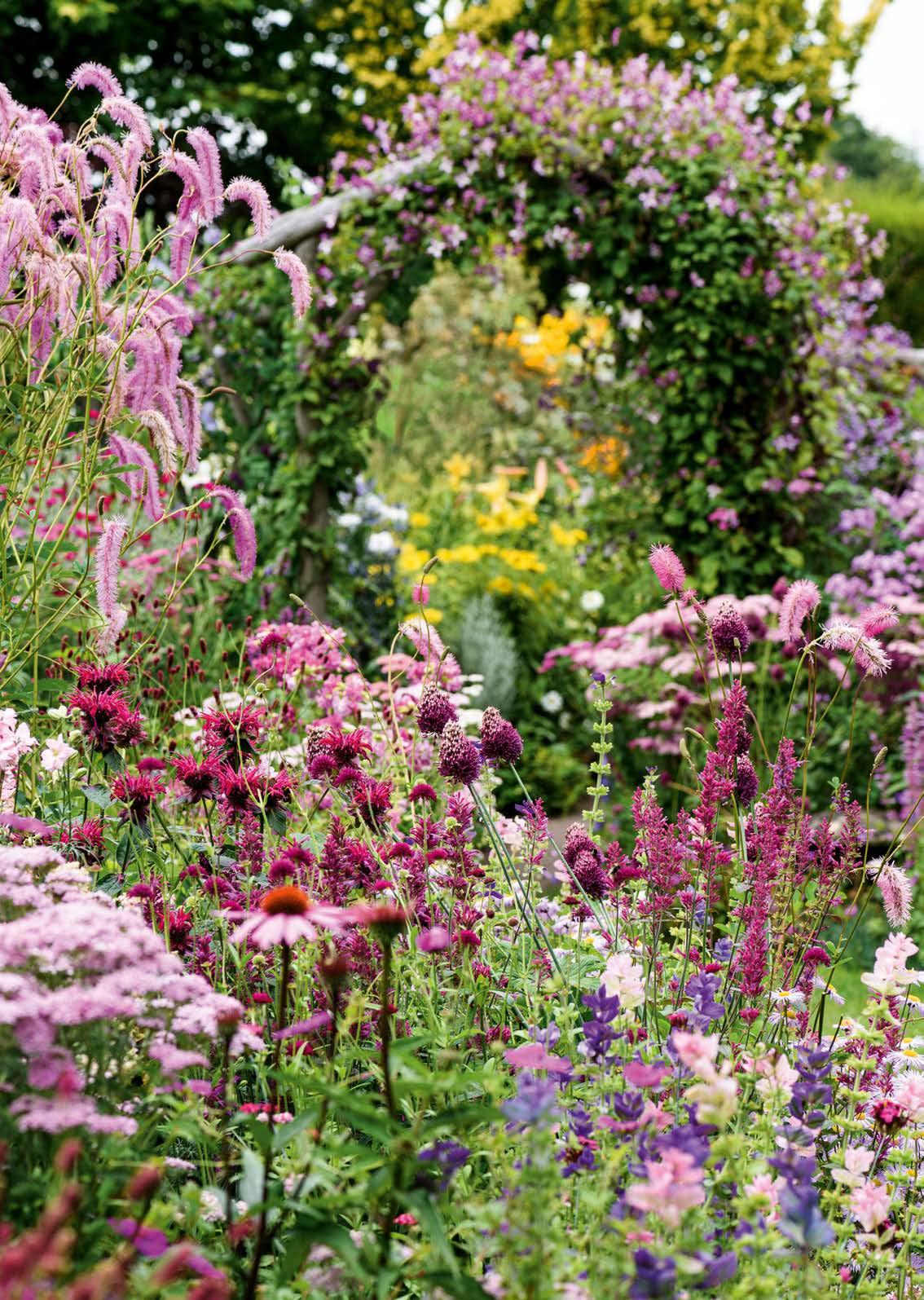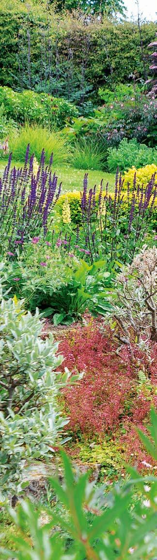 replaced after 30 years. They combine perfectly with the surrounding herbaceous planting, where the slender, dark purple flower spikes of Salvia x superba ‘East Friesland’ and cloud-like clusters of white valerian (Centranthus ruber ‘Albus’) rise up through drifts of vibrant pink Geranium ‘Patricia’, which is a favourite of Vicki’s thanks to its long flowering season. “I tend to do a Chelsea chop on half of it to get more flowers later in the season as well,” she explains.