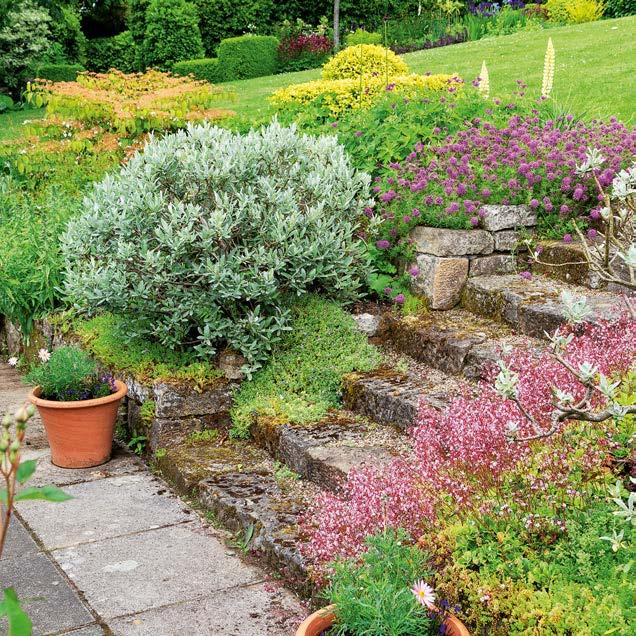 Right Billowing pastel planting on the terrace bank behind the house includes saxifrage, Salvia nemorosa and valerian.