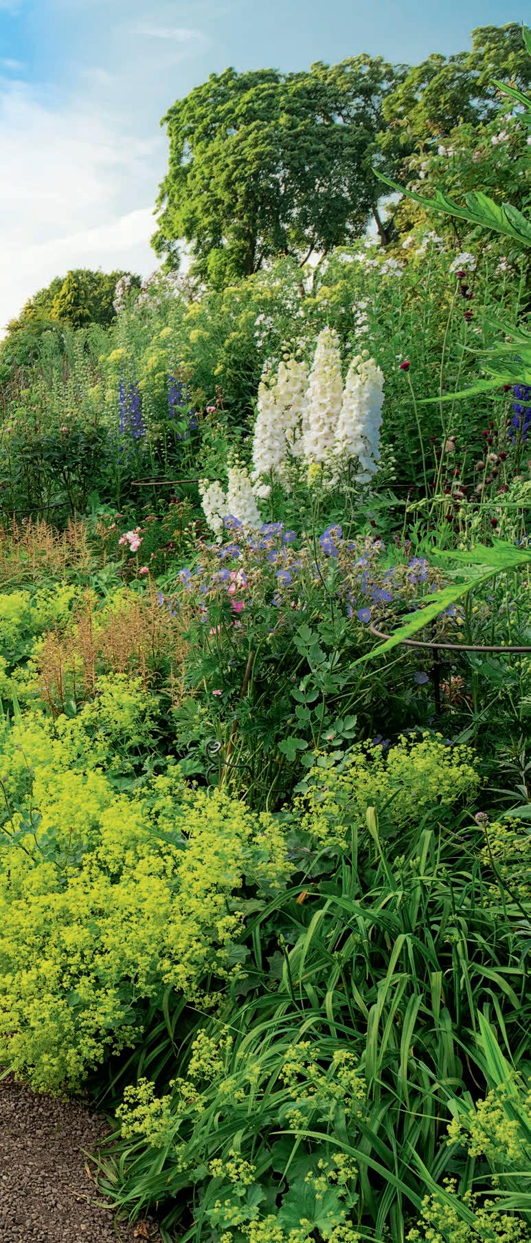 The garden’s elegantly curved design makes the most of any available light, maximising exposure to the sun for the benefit of the plants sheltered within its walls. Gravetye’s walled garden sits midway down a valley and the shape creates a natural air-drainage system, funnelling cold air into tighter spots of the ellipse where a small outlet allows it to escape, acting as a ‘frost gate’ and subsequently protecting more tender plants during spells of colder weather. It’s not known for sure, but this may explain Carolside’s similar design. What we do know is that enclosed within Carolside’s walls is one of Scotland’s most intensely romantic gardens.