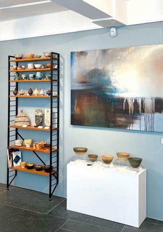 New Craftsman Gallery, St Ives, with paintings by Sarah Woods; Byre Gallery, Millbrook, with paintings by Heath Hearn (top left) and Sophie Harding, and ceramics (including jug) by Lucy Burley; a Standard Ware mug from Leach Pottery, St Ives; Porthminster Gallery, St Ives.