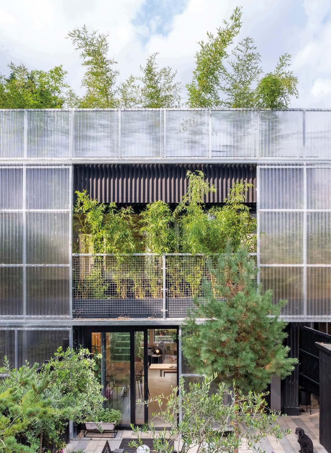 Green House is built from cross-laminated timber, left unfinished inside so it ’ ll never have to be painted, while its fac ade is planted with bamboo that reduces heat on hot days and is irrigated by a water butt on the roof terrace. There’s also an air source heat pump and solar panels – the latter keeping the house almost off-grid in summer – while the concrete breeze blocks and cork flooring are recycled.