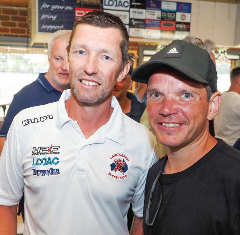 The old and the new: Langwarrin head coach Jamie Skelly (left) and Seaford United counterpart Paul Williams pictured at this year’s Wallace Cup. In the background (partly obscured) is former Frankston Pines head coach Kevin “Squizzy”