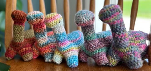 D i n o s a u r / $ 2 5 variety of yarns available in any of the colors shown including Speckle, Sparkle, and Multi-Color styles apx: 8” head to tail, 3” wide, 6” tall