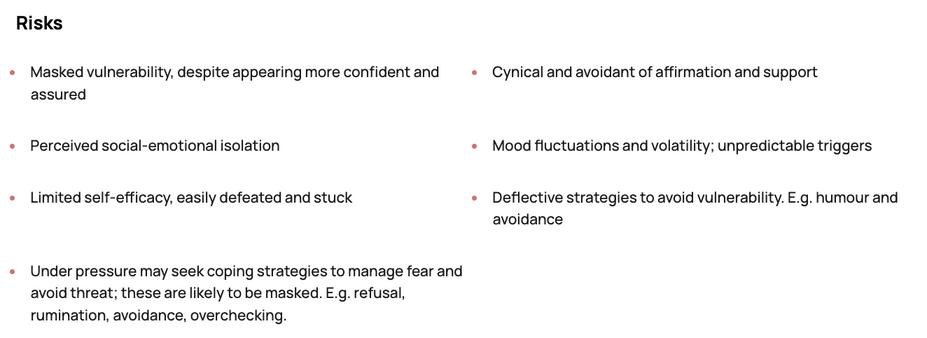 Those who are flagged with Hidden Vulnerability are both self-questioning and socially-questioning. Because this can make them feel vulnerable, they will find ways to make them feel safe, and avoid situations they see as threatening These people are particularly at risk because they are likely to mask their vulnerability. They may not show or tell anyone how they feel, and will be unlikely to get the support they need.