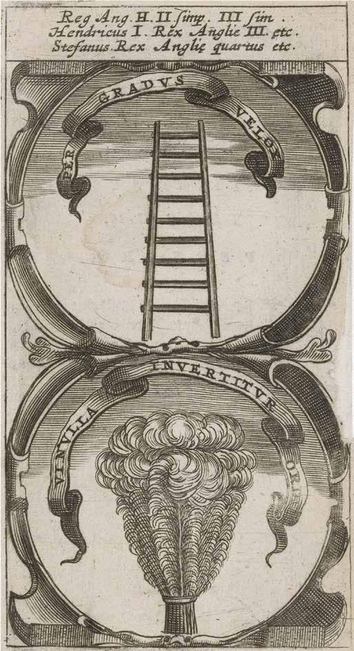 Anonymous, after Aegidius Sadeler, Ladder to heaven / Ostrich feathers, from series Symbola Divina et Humana Ponti cum Imperatorum Regum 1666, engraving, 11.7 × 6.4 cm