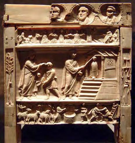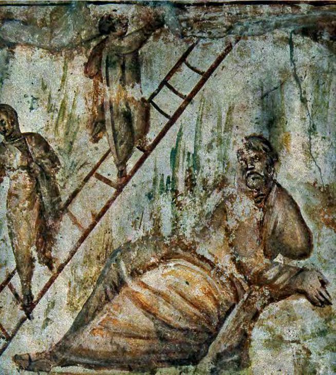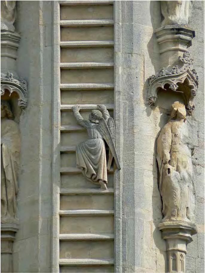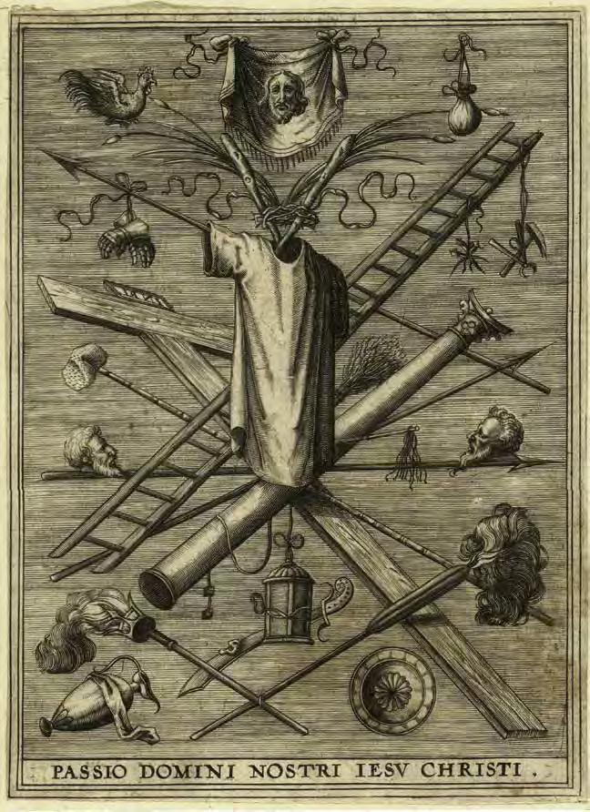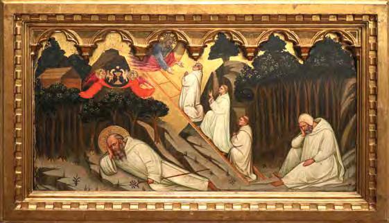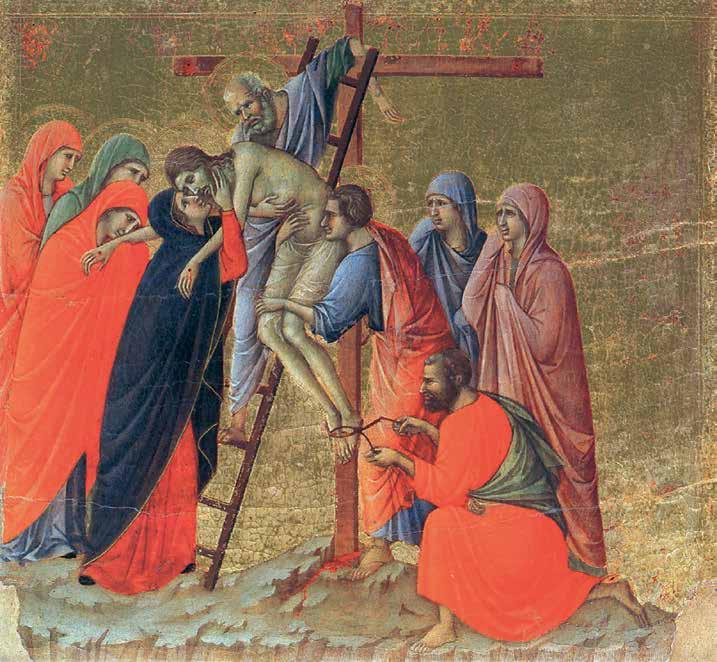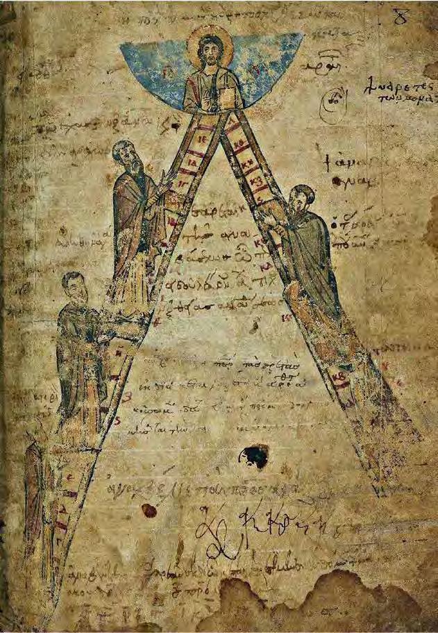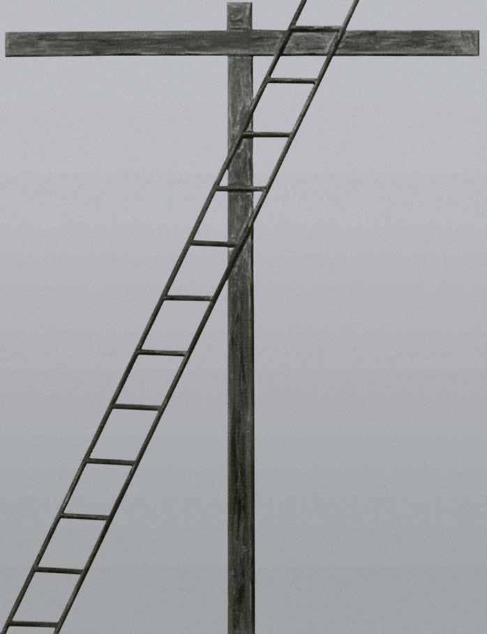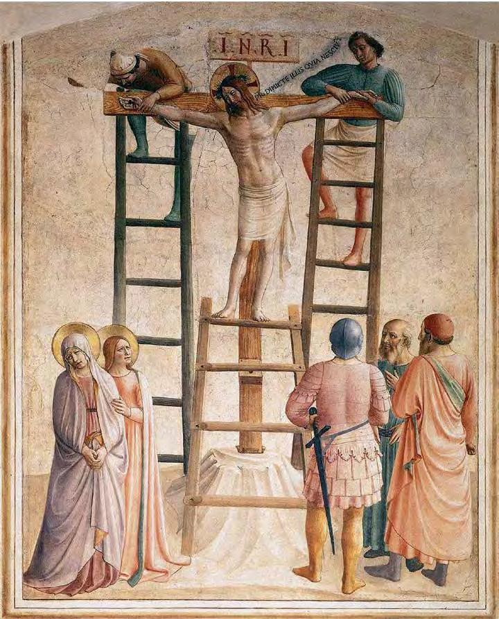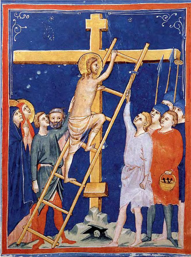 Stairs as a symbol of Christ’s su ering appear in the Catholic tradition as early as the 9th century and is found in icons, cruci xes and retablo. And although the presence of a ladder in “Ascension to the Cross” and “Descent from the Cross” is not mentioned by any Gospel — ladders rst appeared in illustrations and images — ladders are often mentioned in theological manuscripts from the Middle Ages. One can even speak about the formation of established medieval iconography in the image of Christ climbing a ladder to the cruci x, an example of which we see in the illustration by Pacino di Buonaguida to the c. 1320 manuscript “Vita Christi” (V1:102). In Fra Angelico’s “Nailing of Christ to the Cross” (1442) (V1: 106), both executioners and Christ are depicted on ladders leading