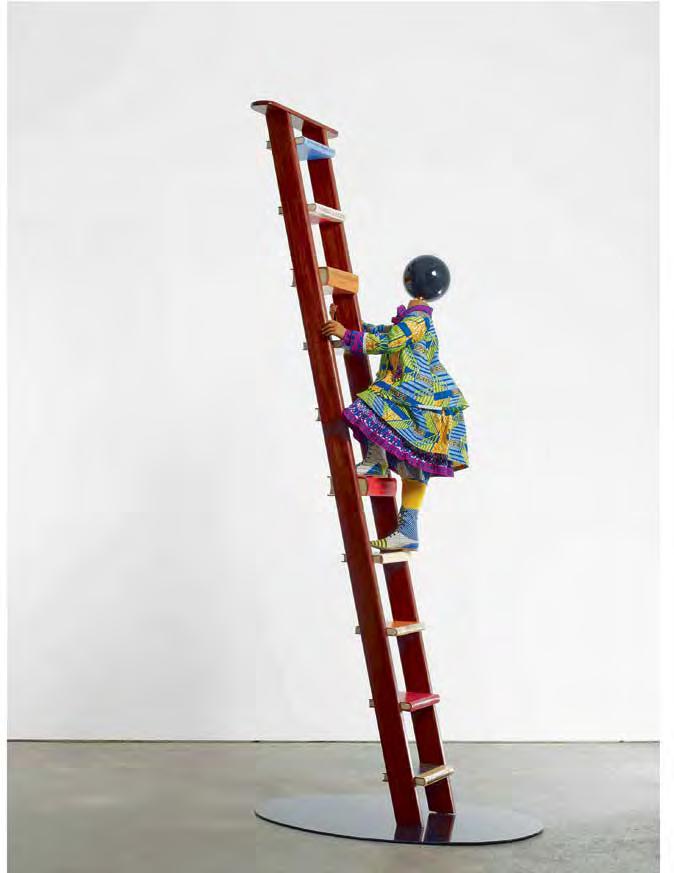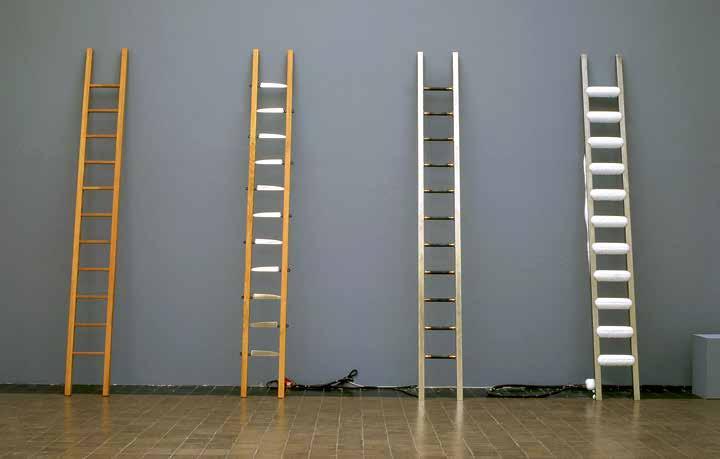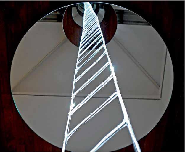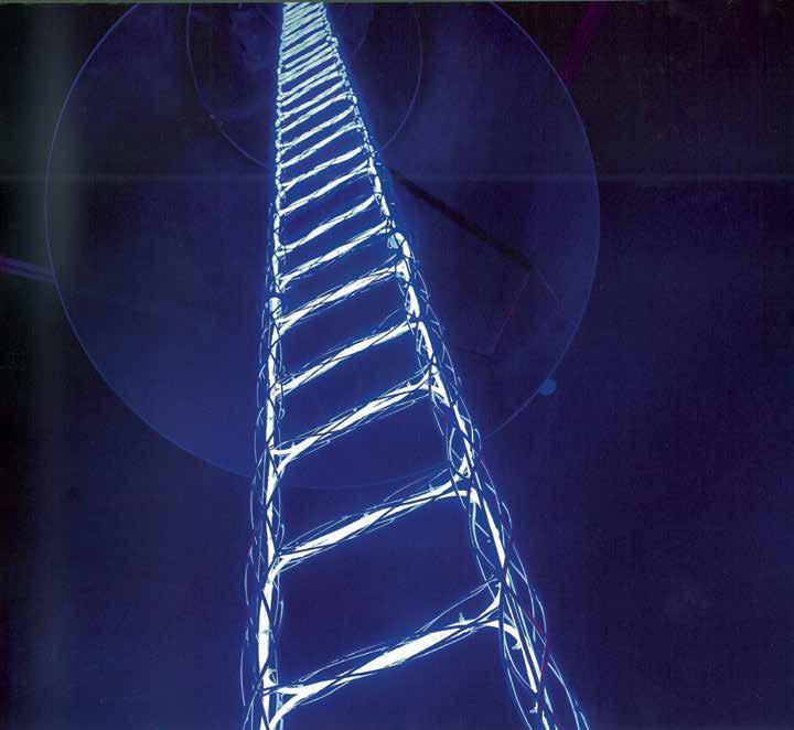 In nity is an integral characteristic of the “stairway to heaven”. This is central to Japanese artist Yayoi Kusama’s installation (V1 : 260). Since the 1960s, a primary theme of Kusama’s work has been numerous repetitions and re ections. Here it takes the form of a luminous road with no beginning or end, of which the viewer encounters only a small segment. An optical illusion makes the construction — a steel ladder wrapped with ber-optic cable and two large round mirrors placed above and below it — appear endless, leading upwards to meta-space.