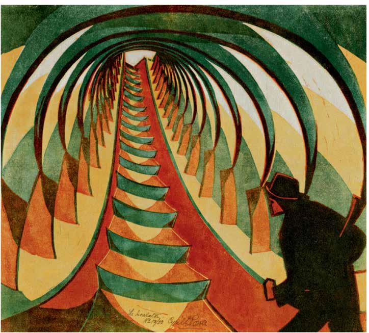 M. C. Escher was one of the rst artists to depict absurd stairs, stairs that are endless and simultaneously devoid of function. In his 1953 lithograph “Relativity” (V2, p. 42) he depicted an architectural structure with several levels united by stairs, full of geometric paradoxes. Escher eventually created a series of lithographs with impossible stairs and constructions, making him a major gure in the school of “impossible reality”. They were created under the in uence of Lionel Penrose and his mathematician son Roger, whose model of a “continuous staircase” in the form of a square with no exit causes the walker, if he walks clockwise, to descend, and if he walks counter-clockwise, to ascend, in both cases endlessly.