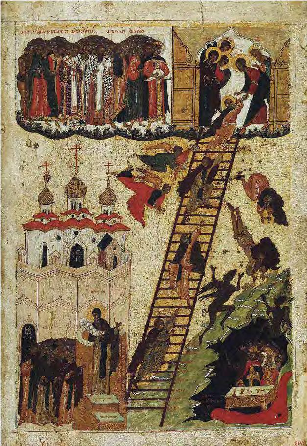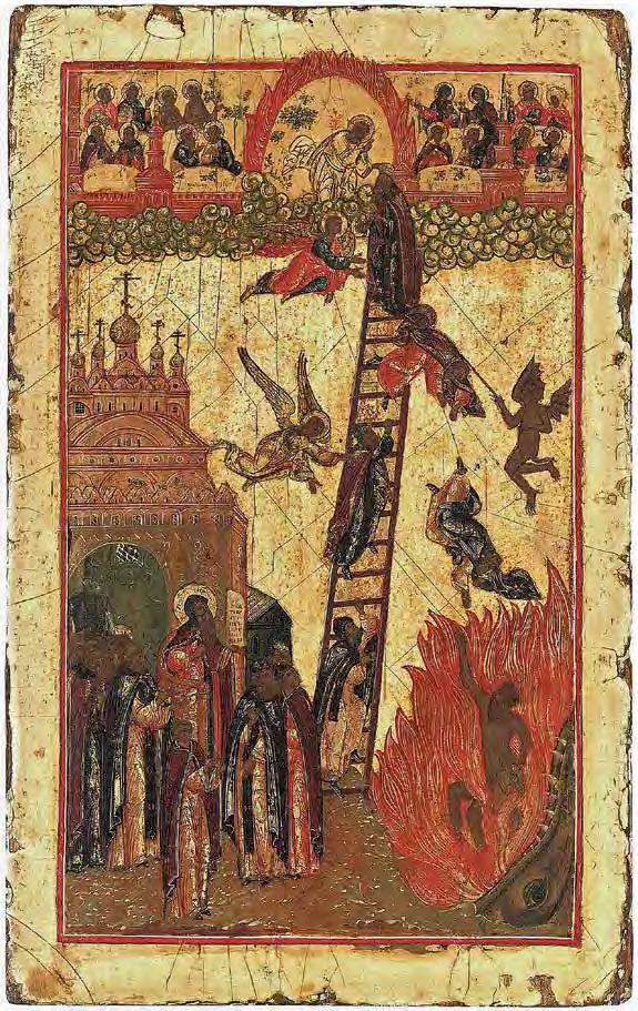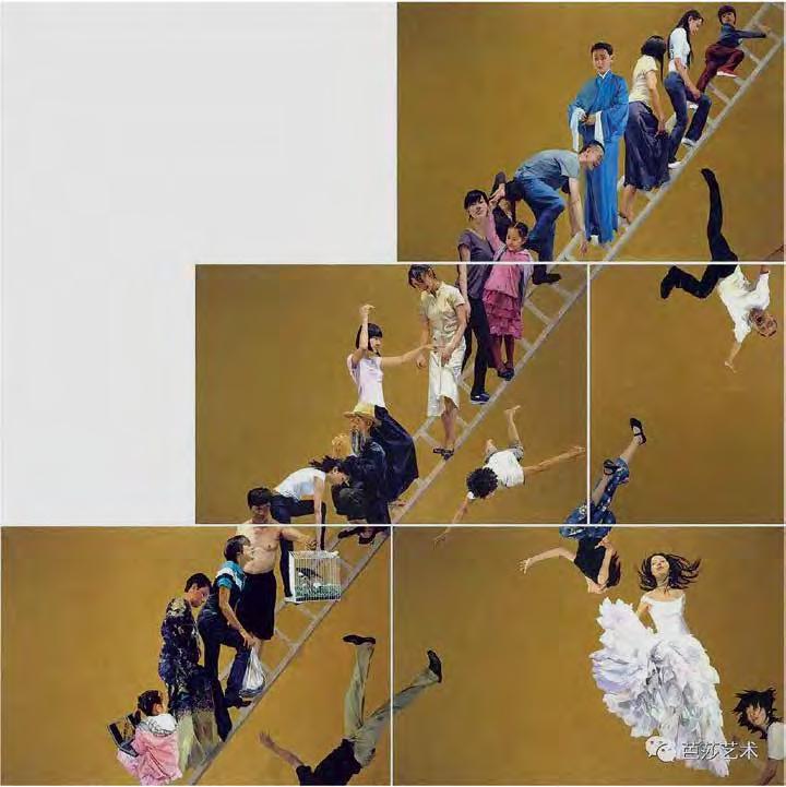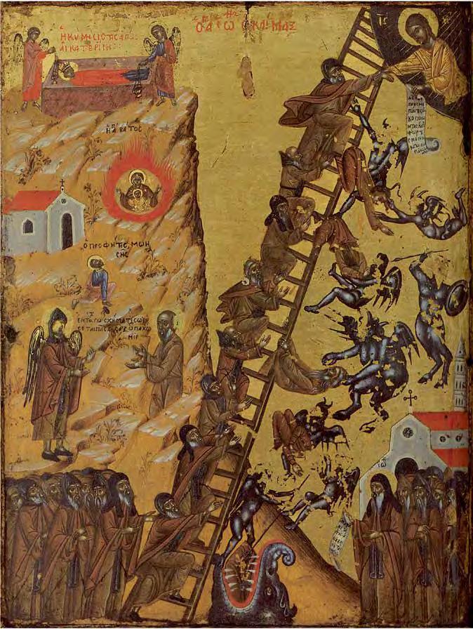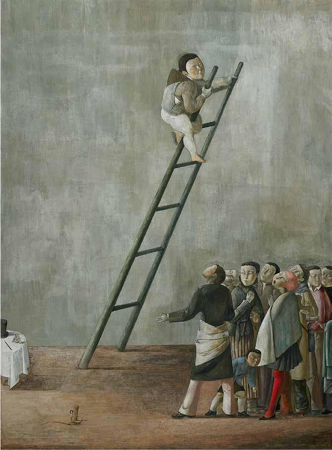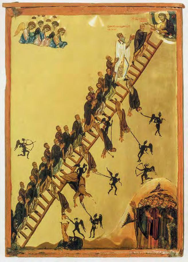 Many artists have created large-scale works on the “stairway to heaven” motif. The Chinese artist Yu Hong’s twenty-foot painting of the same name (V1 : 99) was inspired by the 12thcentury icon “The Ladder of Divine Ascent”(V1 : 98) in St Catherine’s monastery at the foot of Mount Sinai in Egypt. In Hong’s interpretation, men and women of di erent ages climb up or fall from a ladder that has no end or beginning. The dynamic poses and the characteristic details of their clothing of each character reveal their respective social status. This lends the work a theatrical-satirical tone and distances it from the sacred and sublime original.