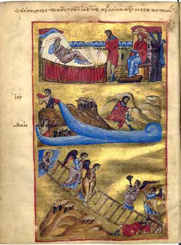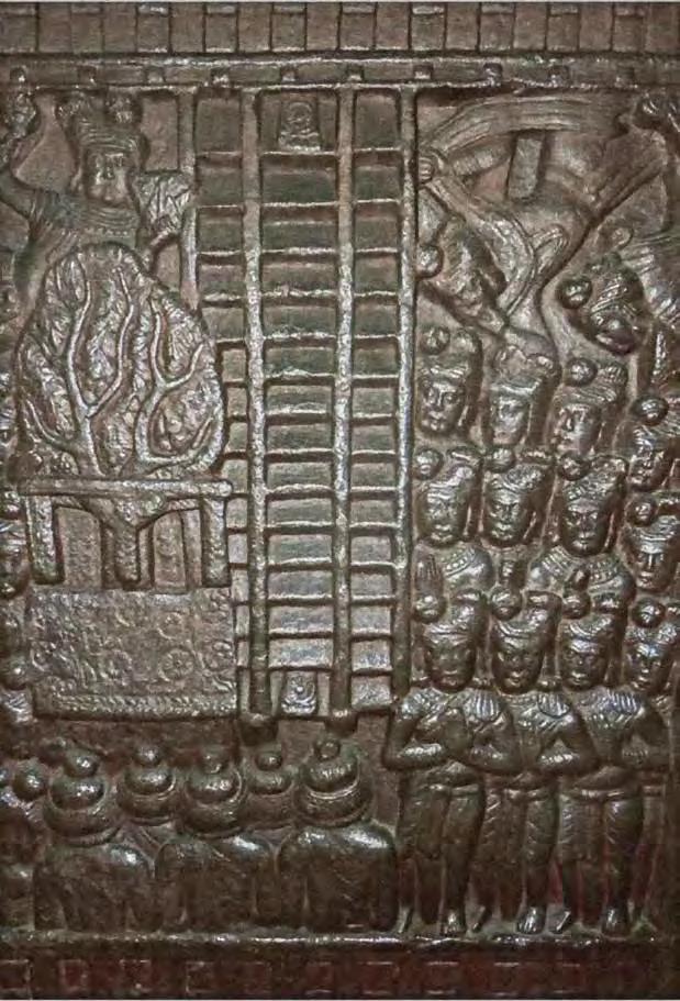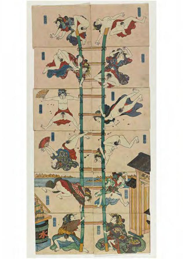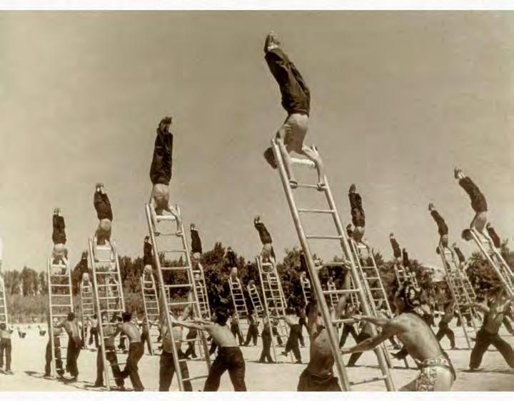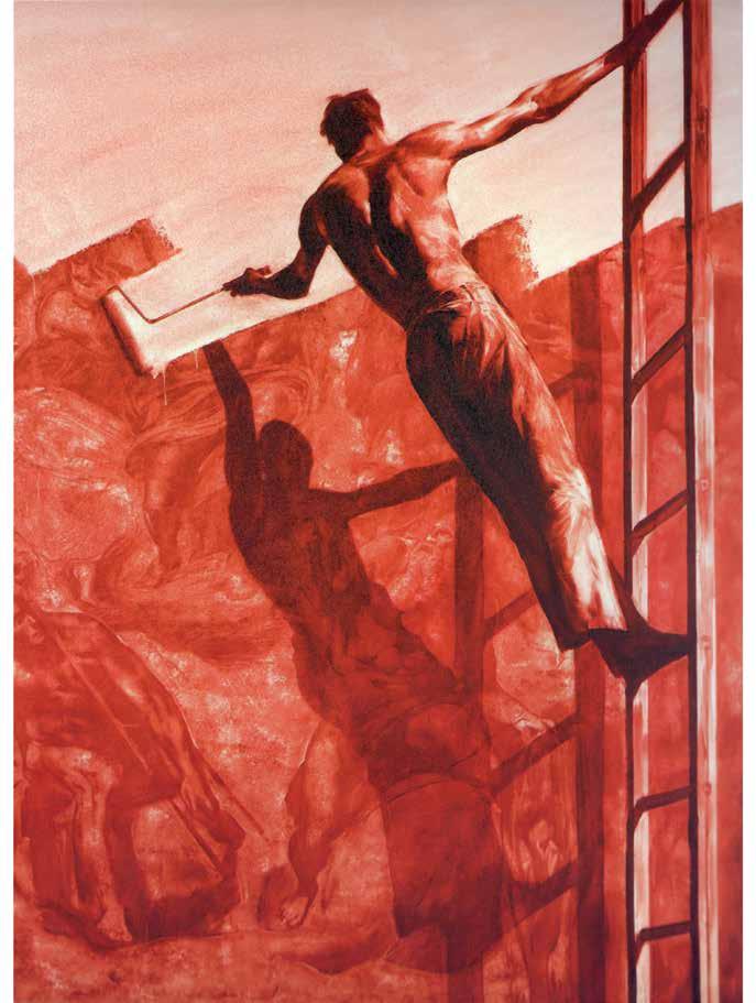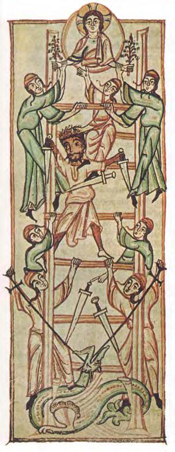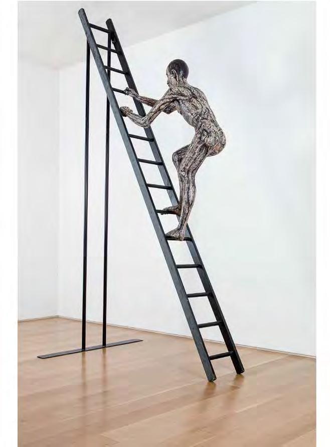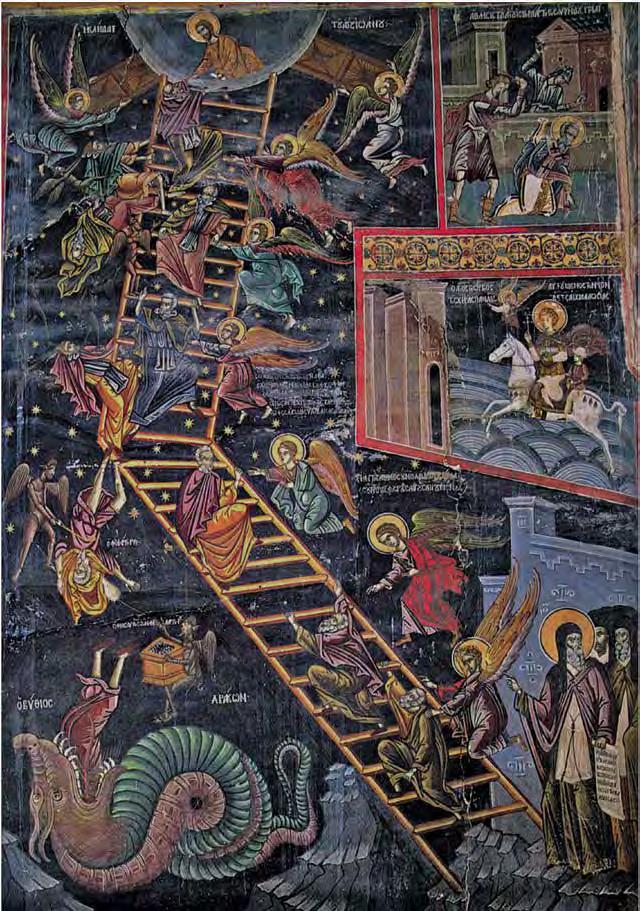 Many artists have created large-scale works on the “stairway to heaven” motif. The Chinese artist Yu Hong’s twenty-foot painting of the same name (V1 : 99) was inspired by the 12thcentury icon “The Ladder of Divine Ascent”(V1 : 98) in St Catherine’s monastery at the foot of Mount Sinai in Egypt. In Hong’s interpretation, men and women of di erent ages climb up or fall from a ladder that has no end or beginning. The dynamic poses and the characteristic details of their clothing of each character reveal their respective social status. This lends the work a theatrical-satirical tone and distances it from the sacred and sublime original.