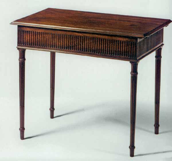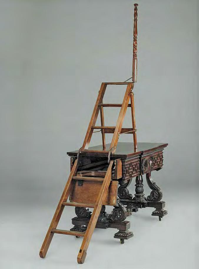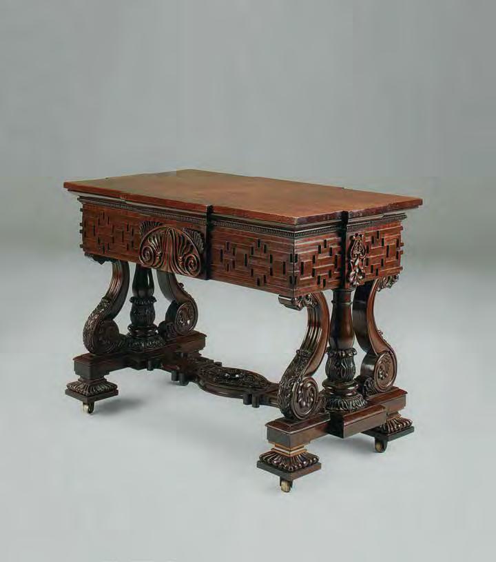 18 (с. 294). William IV Library Step Table, 1830s, mahogany Of breakfront outline, the beaded moulded frieze centered by tablet with lotus scroll ornament between the blind fret ornament, tted with sliding compartment with fallfront carved with lotus scroll and Greek key ornament concealing a sliding mechanism with extending steps, with turned column handrestand treads, steel stretchers on column and scroll end supports with acanthus leaf carving and gadrooned square feet joined be a shaped stretcher centered by a owerhead with foliate scroll ornament.