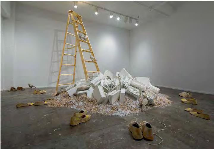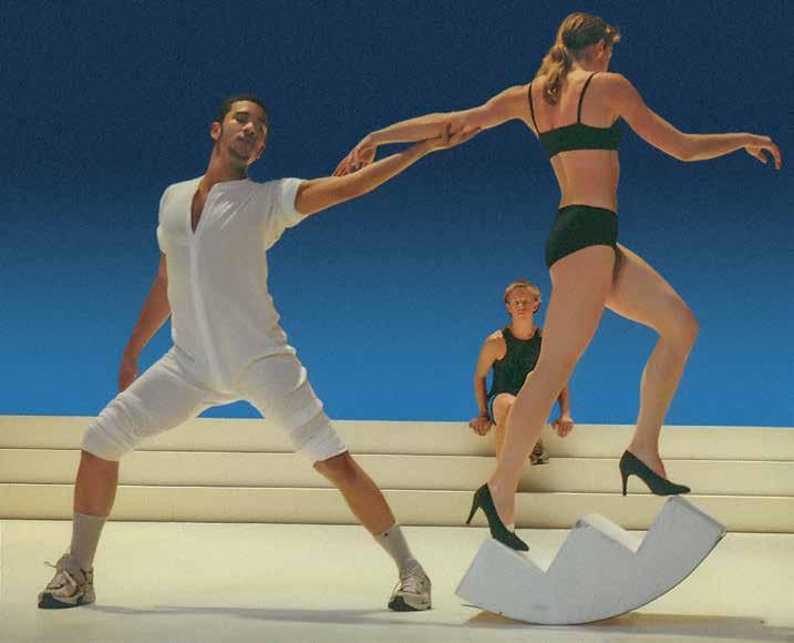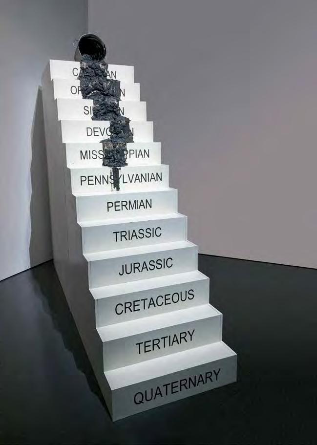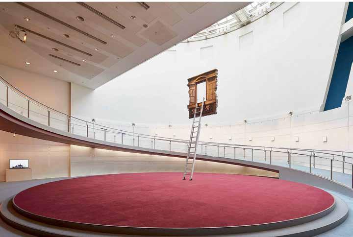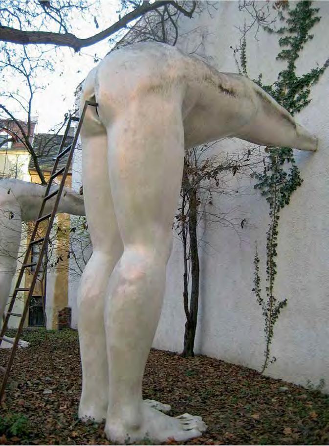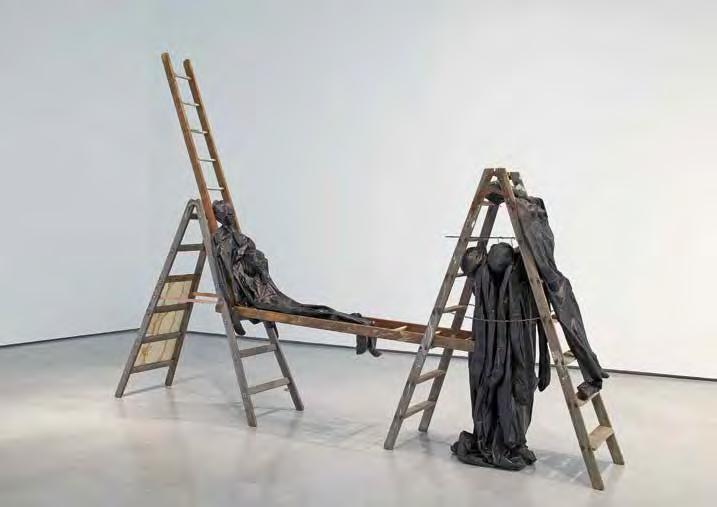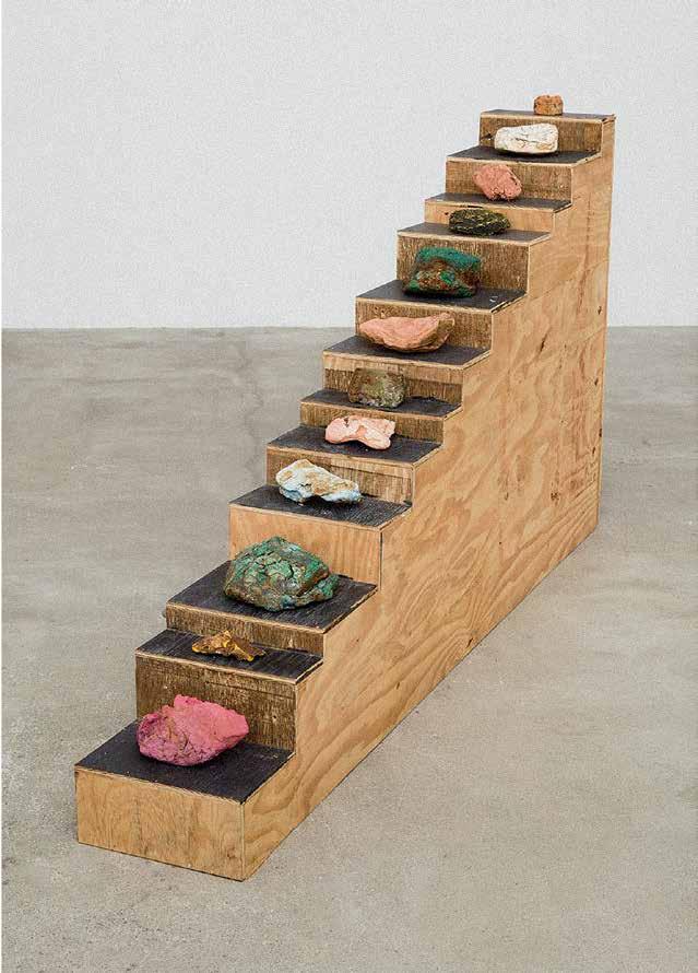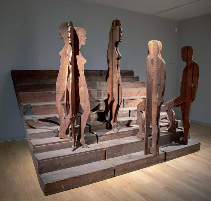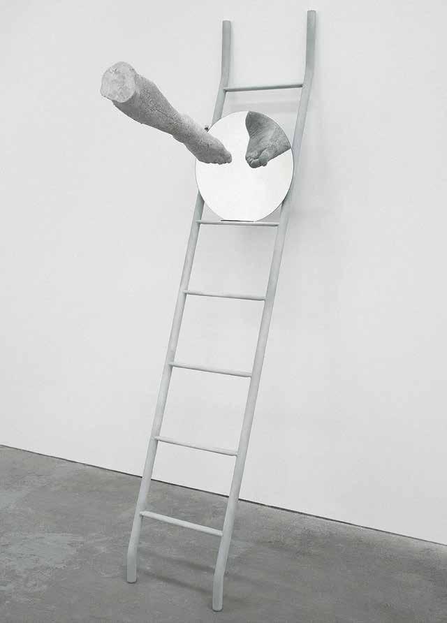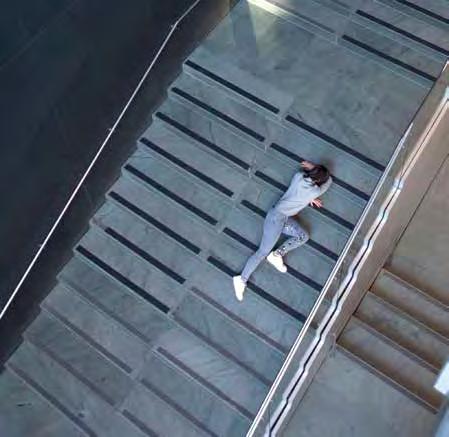 The phenomenon of movement both up and down steps is the subject of Mario Ceroli’s sculpture “La Scala” (V1, p. 186). His staircase with pro le cut-outs of men and women, made of unpainted wood, captures the various phases of this movement, focusing on the contrast of static and dynamic. In her live installation “Plastic” (2015–16) by the artist and choreographer Maria Hassabi explores the same dichotomy of static and dynamic, examining pauses both plastic and temporal in a museum space. Hassabi placed performers along the ight of stairs lying perfectly still, contrasting sharply with the rapid ow of visitors around them. Thus, the artist expands our idea of the obviously utilitarian signi cance of the stairs in the museum, slowing down the rhythm of our reaction to its meaning.