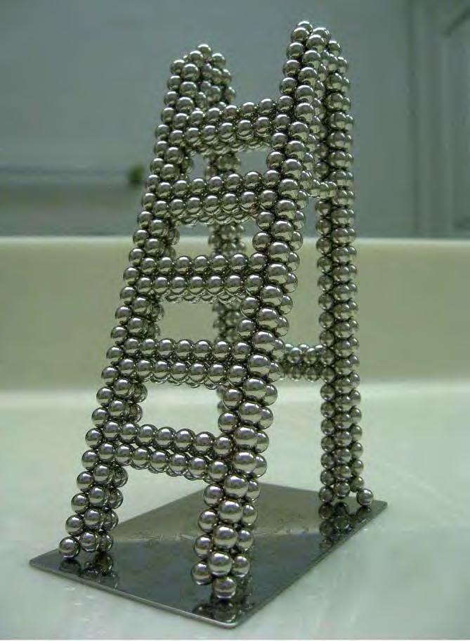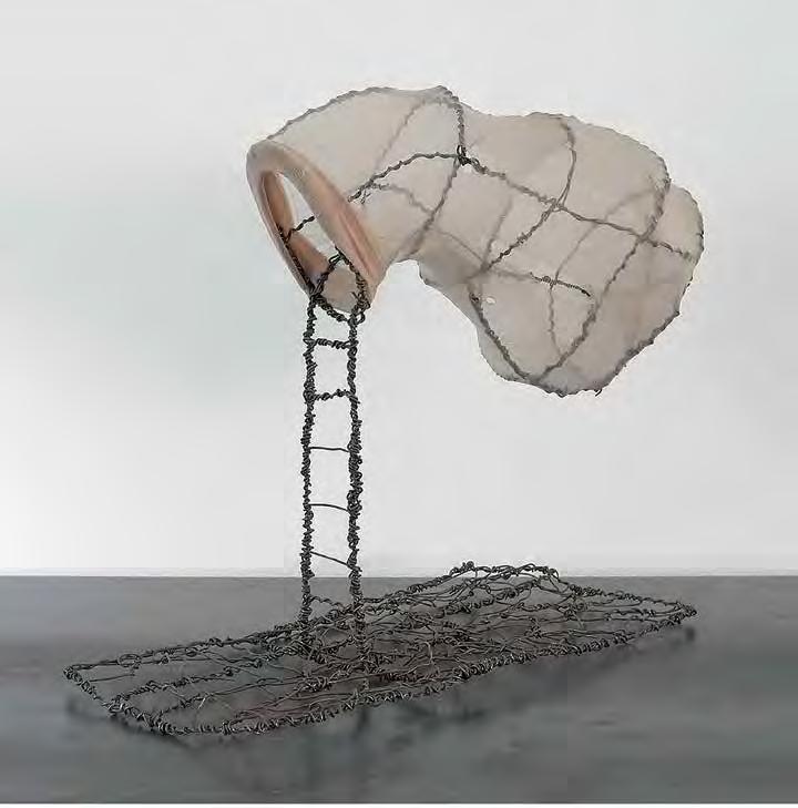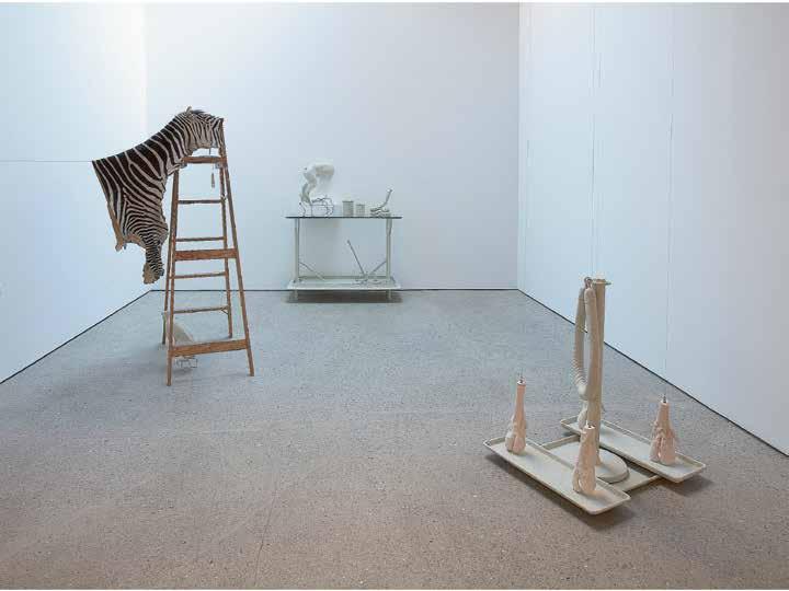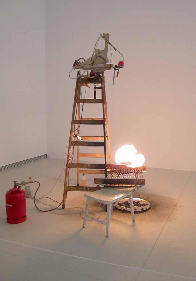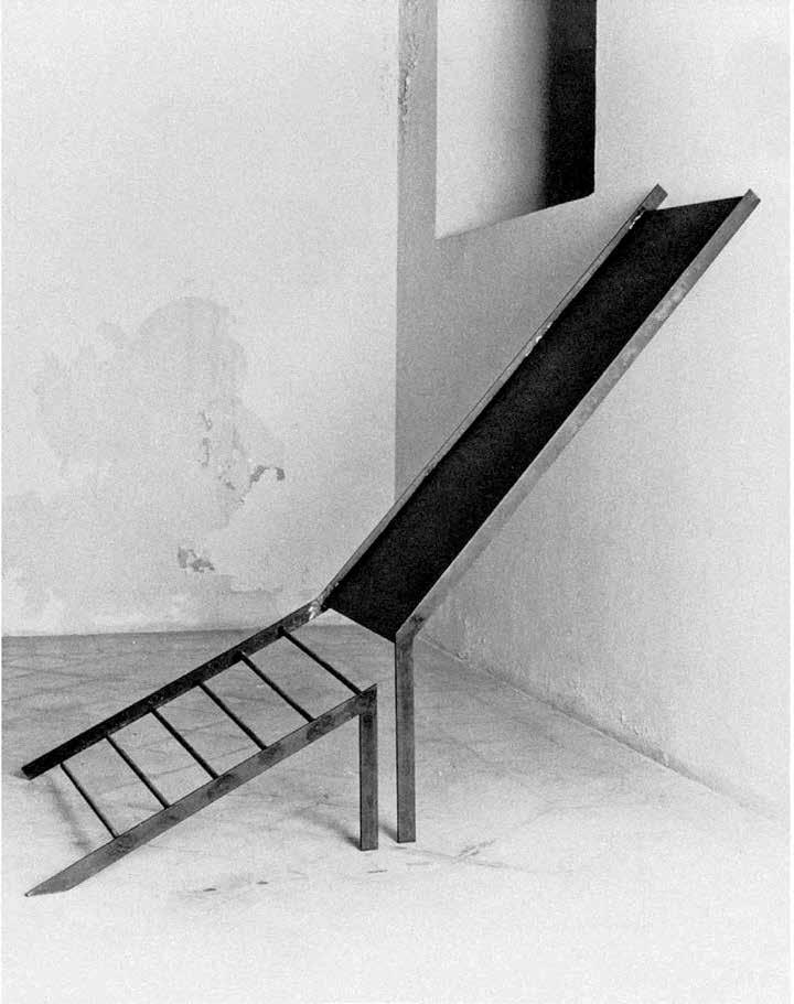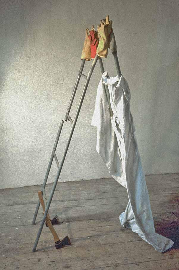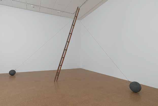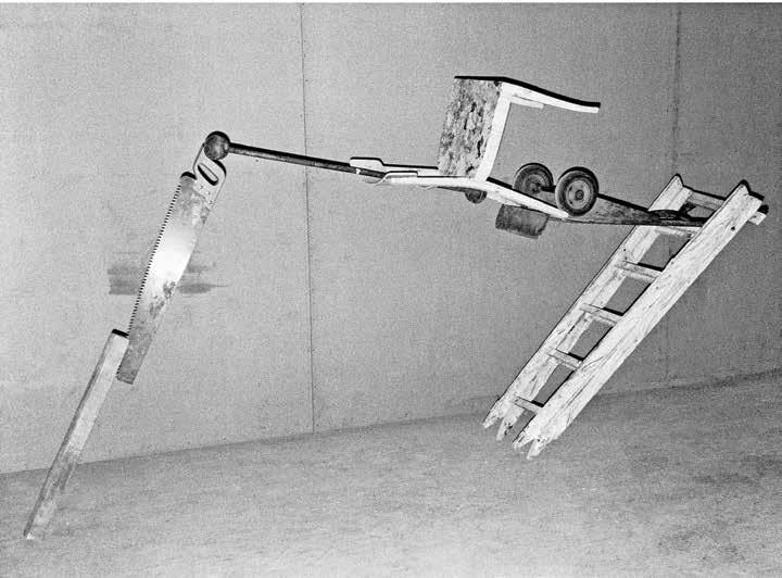 Unlike Kcho’s rusty machetes, which recall Cuba’s history but pose only a metaphorical threat, the sharpened steel knife-steps in Marina Abramovic’s 1996 installation “Double Edge” (V1, p. 126–127) can cause real physical harm. Here, as in much of her work, Abramovic examines the limits of physicality, provoking in the viewer an emotional involvement on the level of re ex. The work consists of four ladders with rungs made of di erent materials — from ordinary smooth wood to knife blades, heated metal and icy rails. The sight of these ladders whose familiar form has been transformed into something dangerous causes psychological discomfort in the viewer. These “dangerous steps” are a metaphor for trials that have to be overcome by overcoming mental and physical fears. In the museum setting, this installation did not involve physical contact, but in 2002, Abramovic revisited the ladders in her performance piece, “The House with the Ocean View” (V1, p. 124–125). For twelve days the artist lived in specially built minimalist rooms, open for viewing by visitors to the gallery. Under these conditions, ordinary actions take on the ritual character of a trial, a test combining asceticism and total publicity. Ladders with knives for rungs physically prevent the artist from going beyond the allotted space, thus an inanimate passive object becomes an actor in the performance, demonstrating its power over the will of the artist.